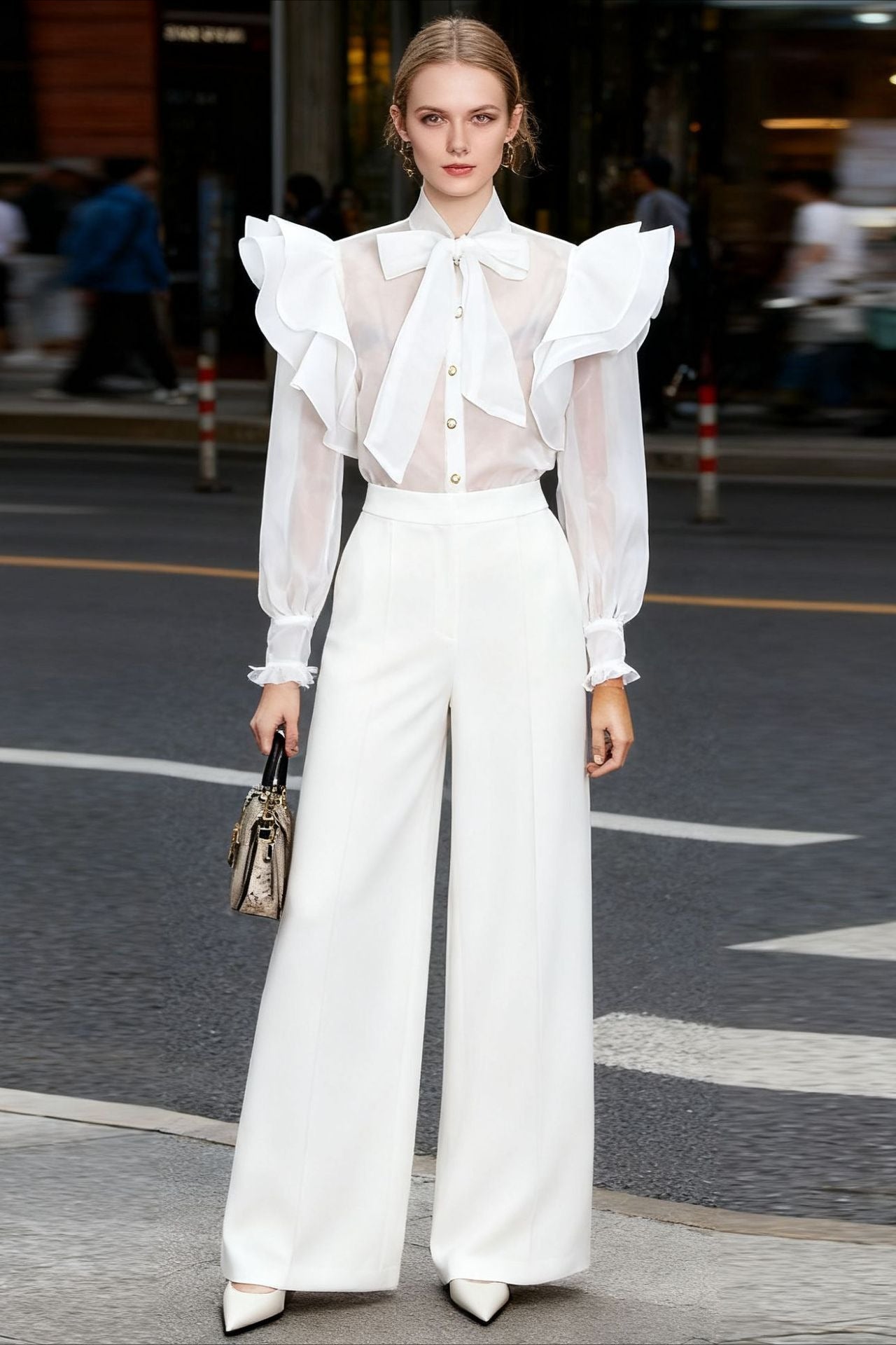 White Cropped Chiffon Ruffle Blouse