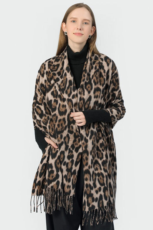 Faux Cashmere Leopard Print Thick Fringed Scarf
