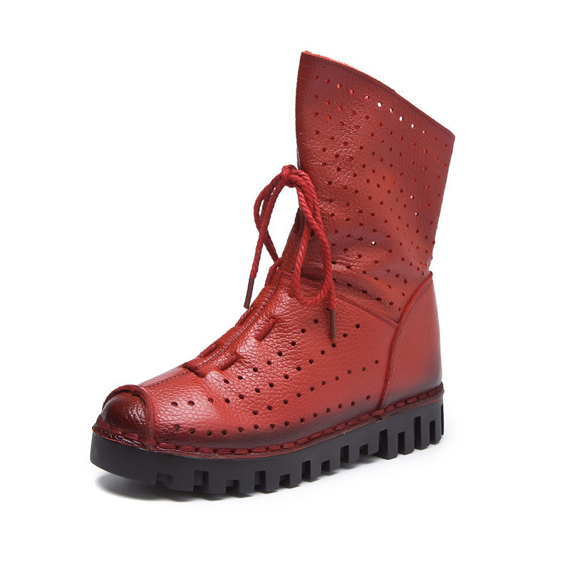 Women's Layer Cowhide Hollow Flat Soft Bottom Boots