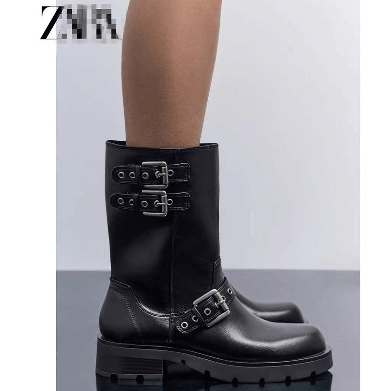 Women's British Style Flat Motorcycle Fashionable Retro Boots