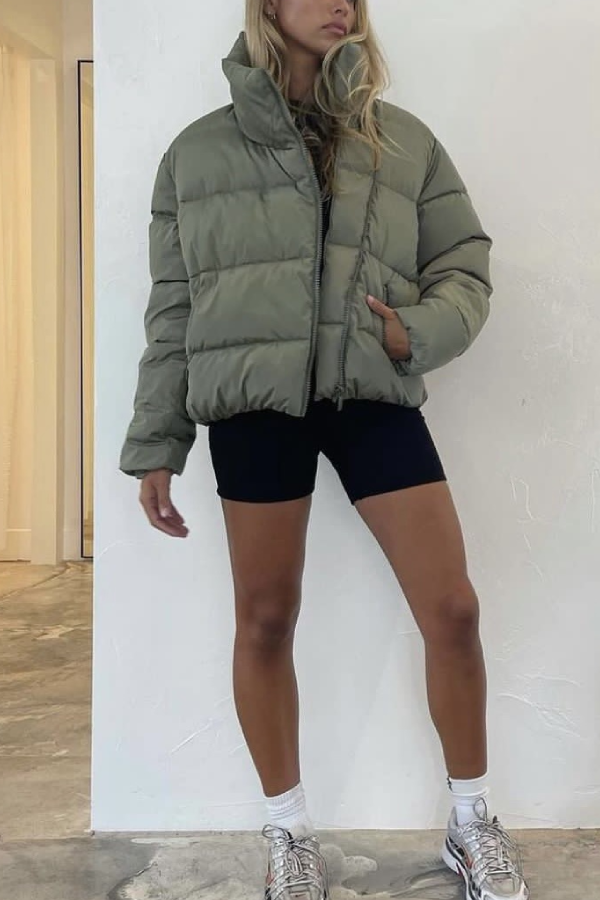 Vintage Solid Short Padded Coat with High Neck and Zipper