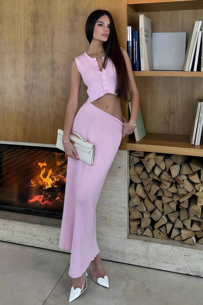 Pink Knit Sleeveless Cardigan Crop Top High Waist Skirt Set