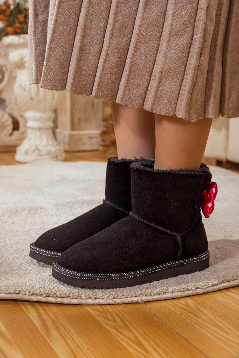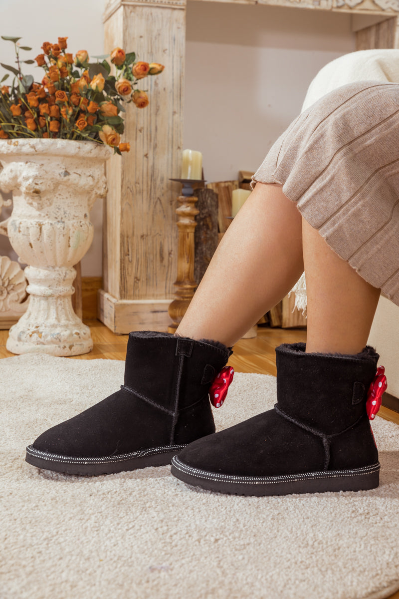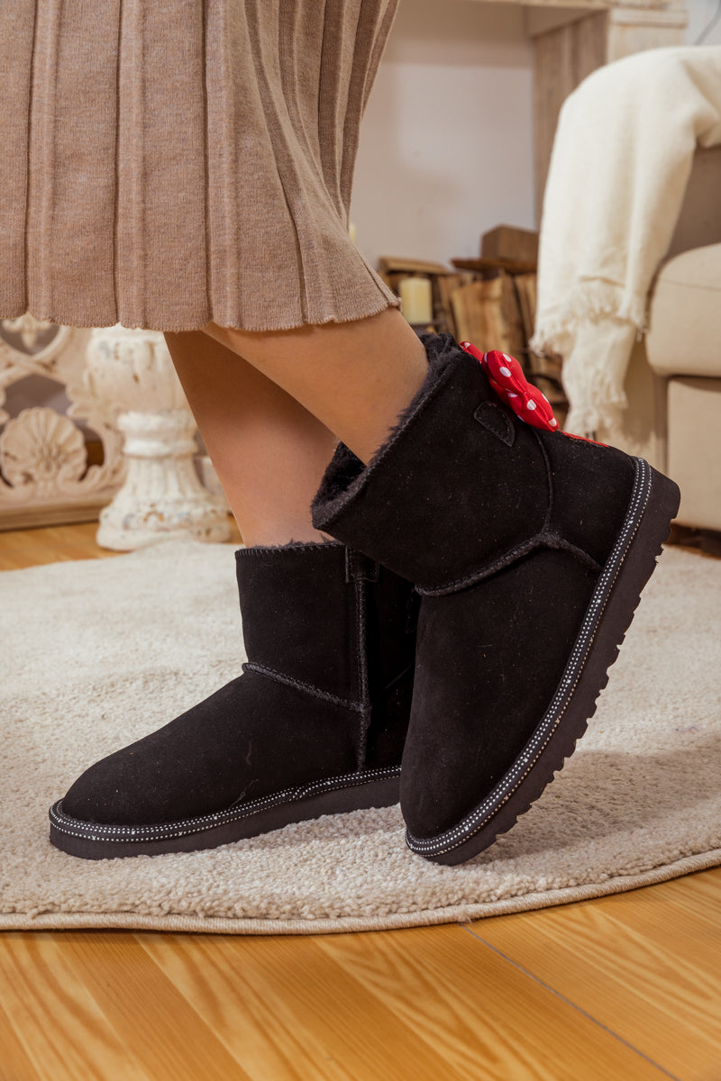A red polkadot ribbon_bow detail puts a_cute feminine twist on this cutest_shearling style in these genuine suede boots. A plush faux fur lining cushions your feet in supreme softness and warmth.