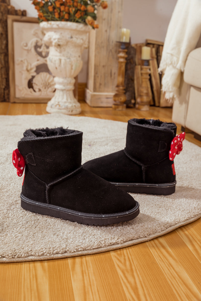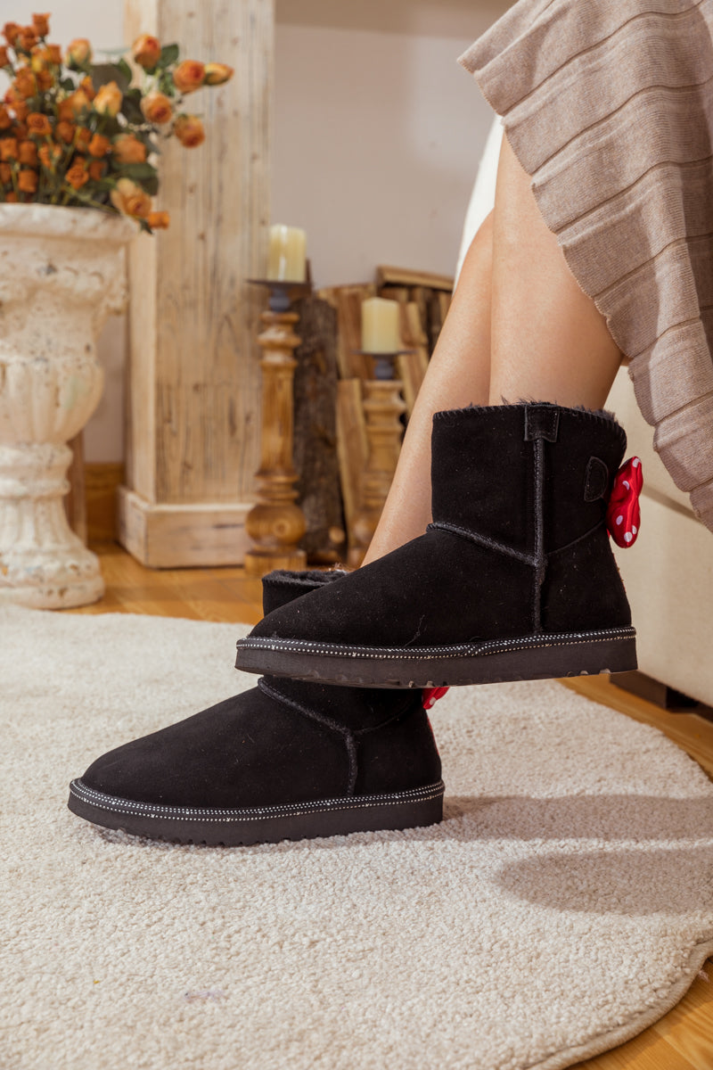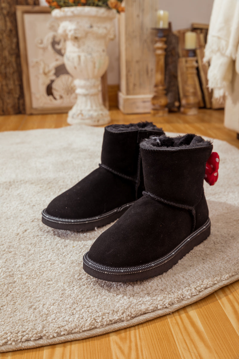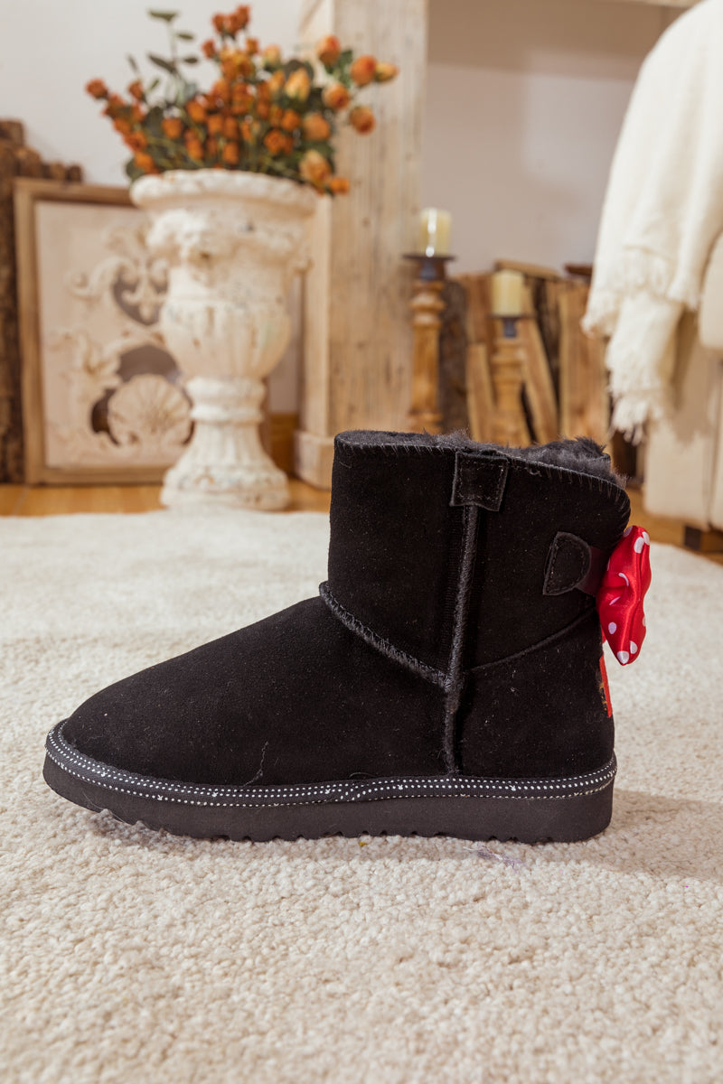 A red polkadot ribbon_bow detail puts a_cute feminine twist on this cutest_shearling style in these genuine suede boots. A plush faux fur lining cushions your feet in supreme softness and warmth.
