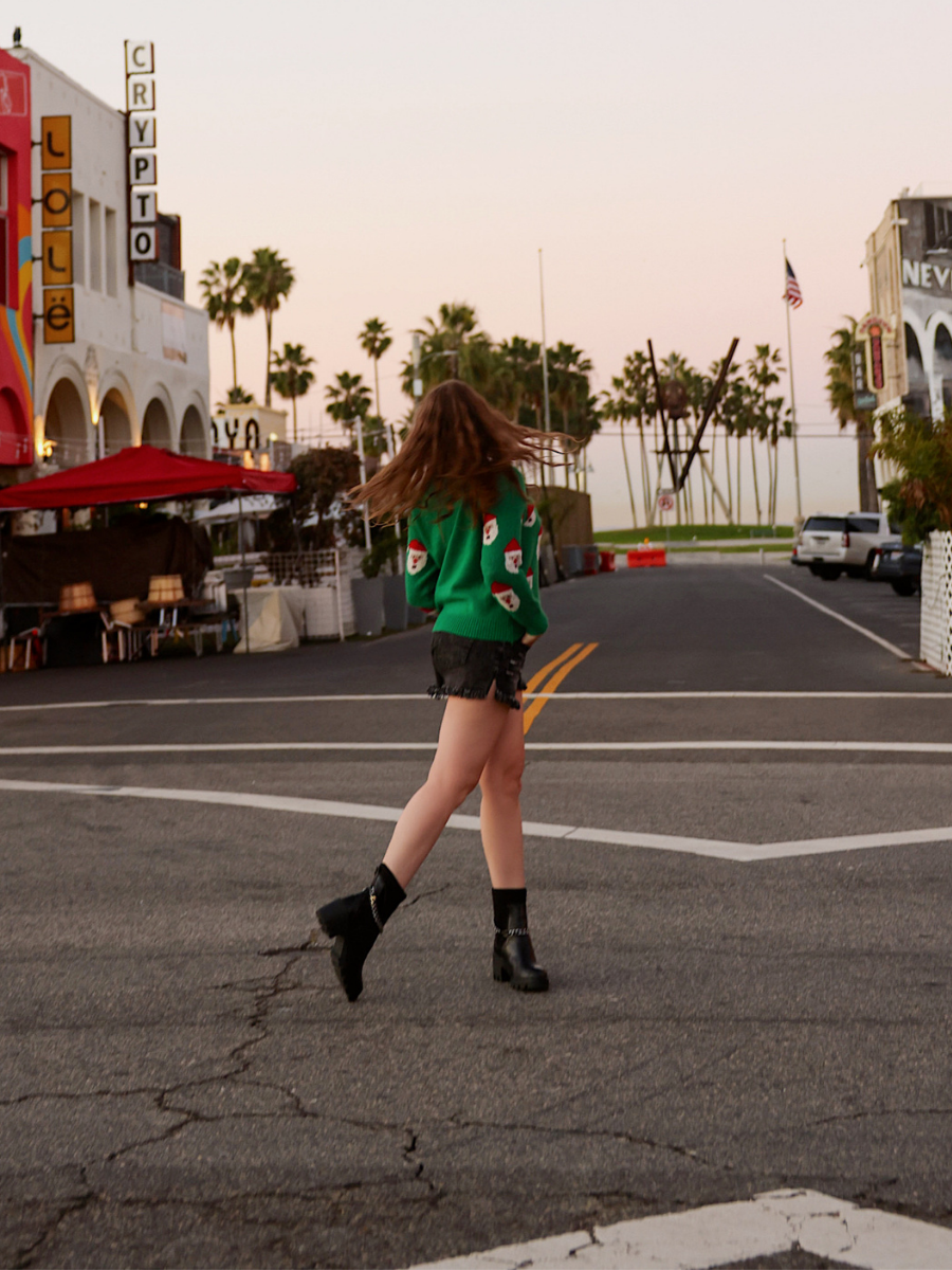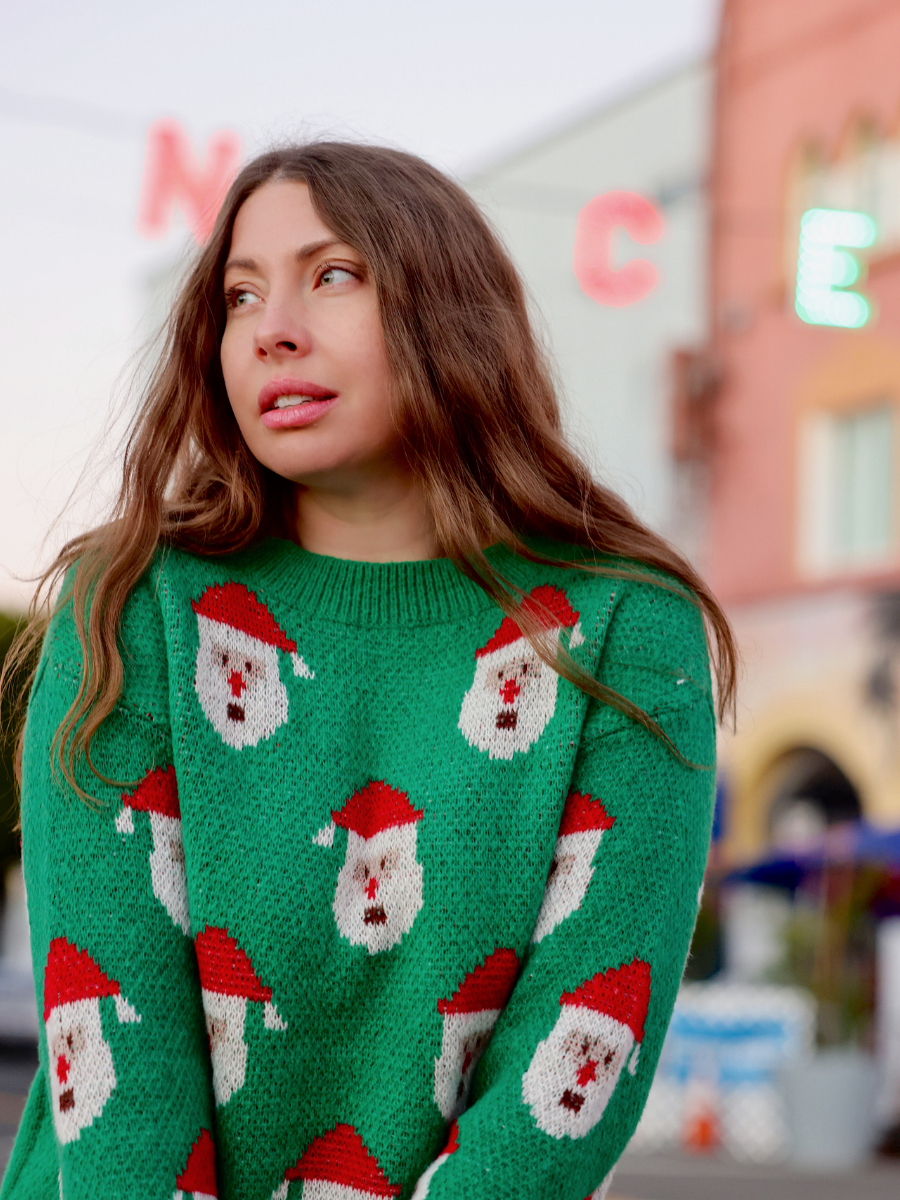 Get your wardrobe into the holiday spirit with this_christma_sweater that boasts fun_santas accents and vibrant seasonal colors.