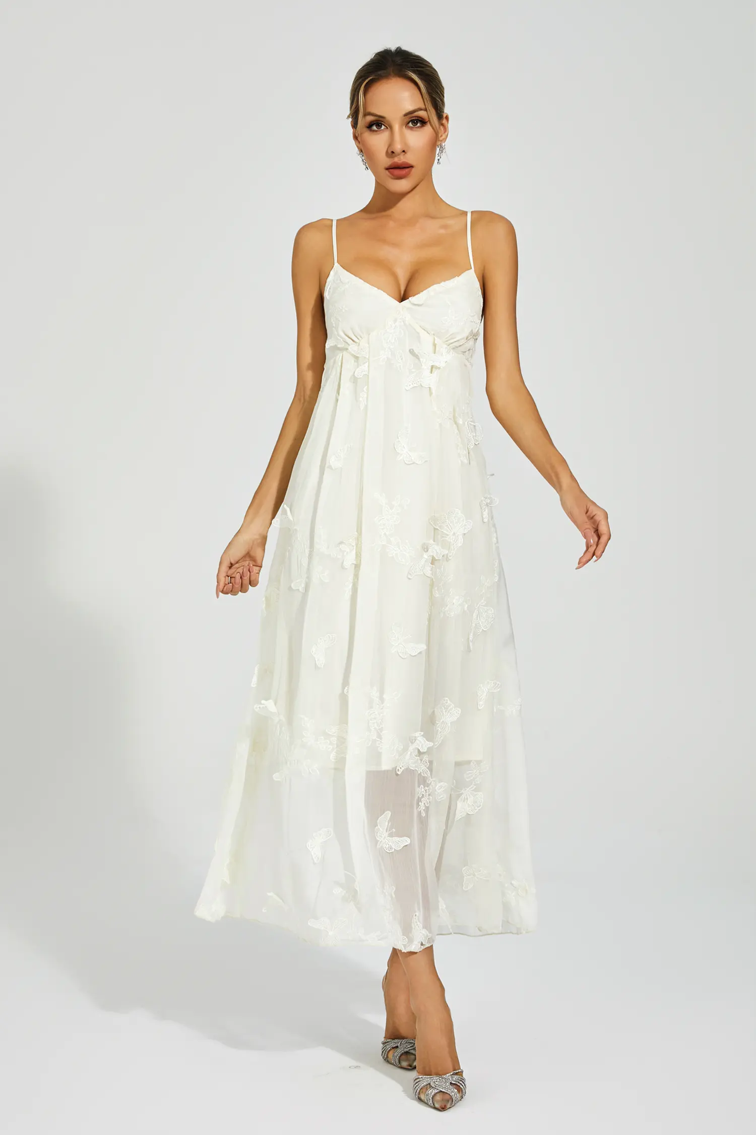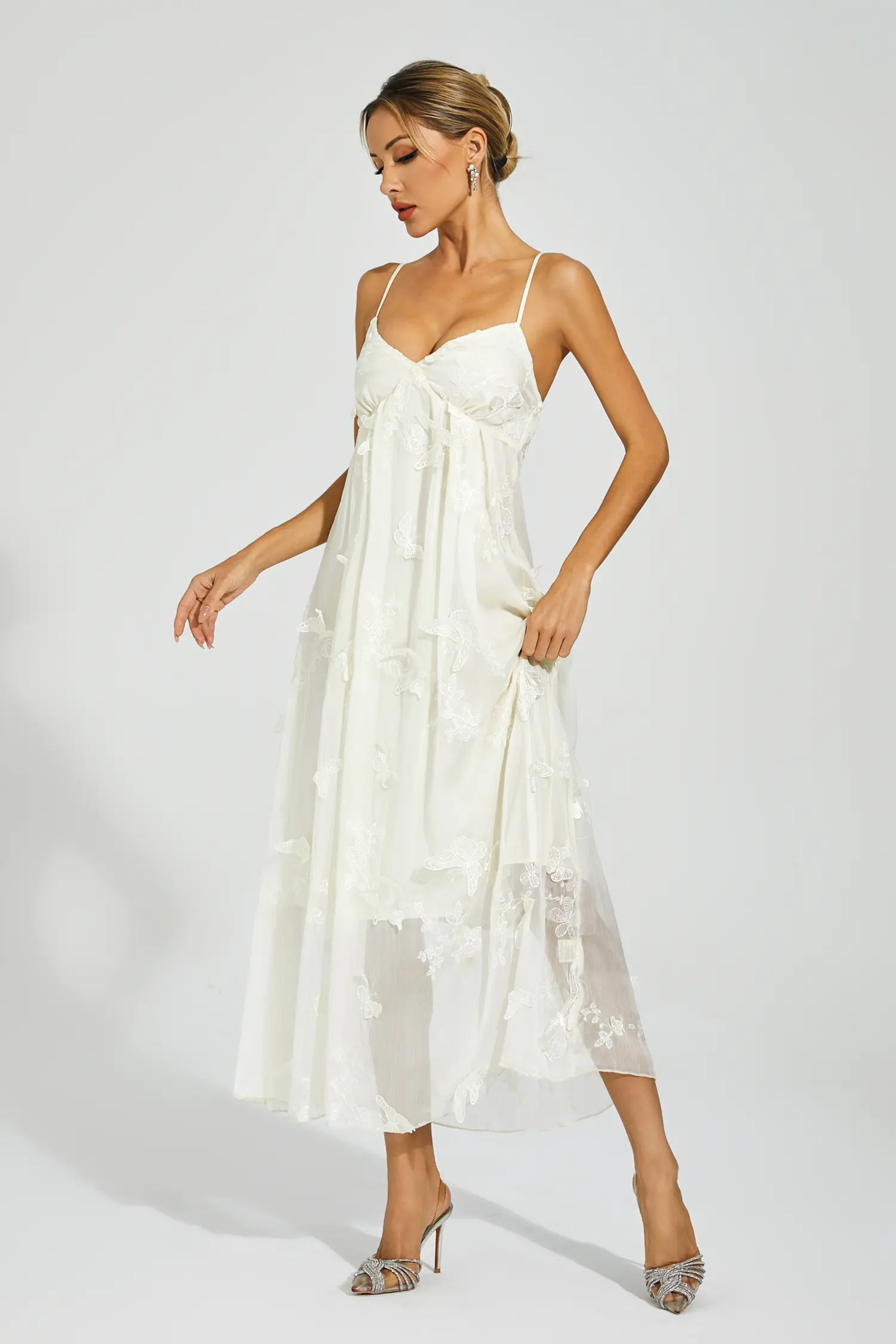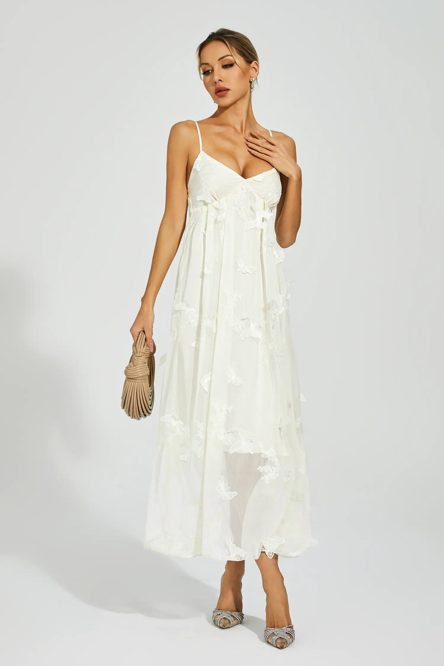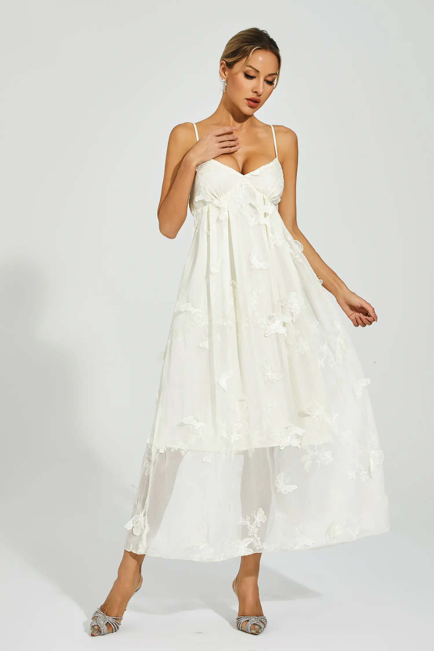 The Araceli White Butterfly Embroidery Slip Dress exudes elegance and allure. Crafted with intricate butterfly embroidery, this slip dress is perfect for a romantic date night. The delicate lace straps add a touch of sensuality, creating a stunning and sophisticated look. Make a lasting impression with this captivating and fashionable piece.