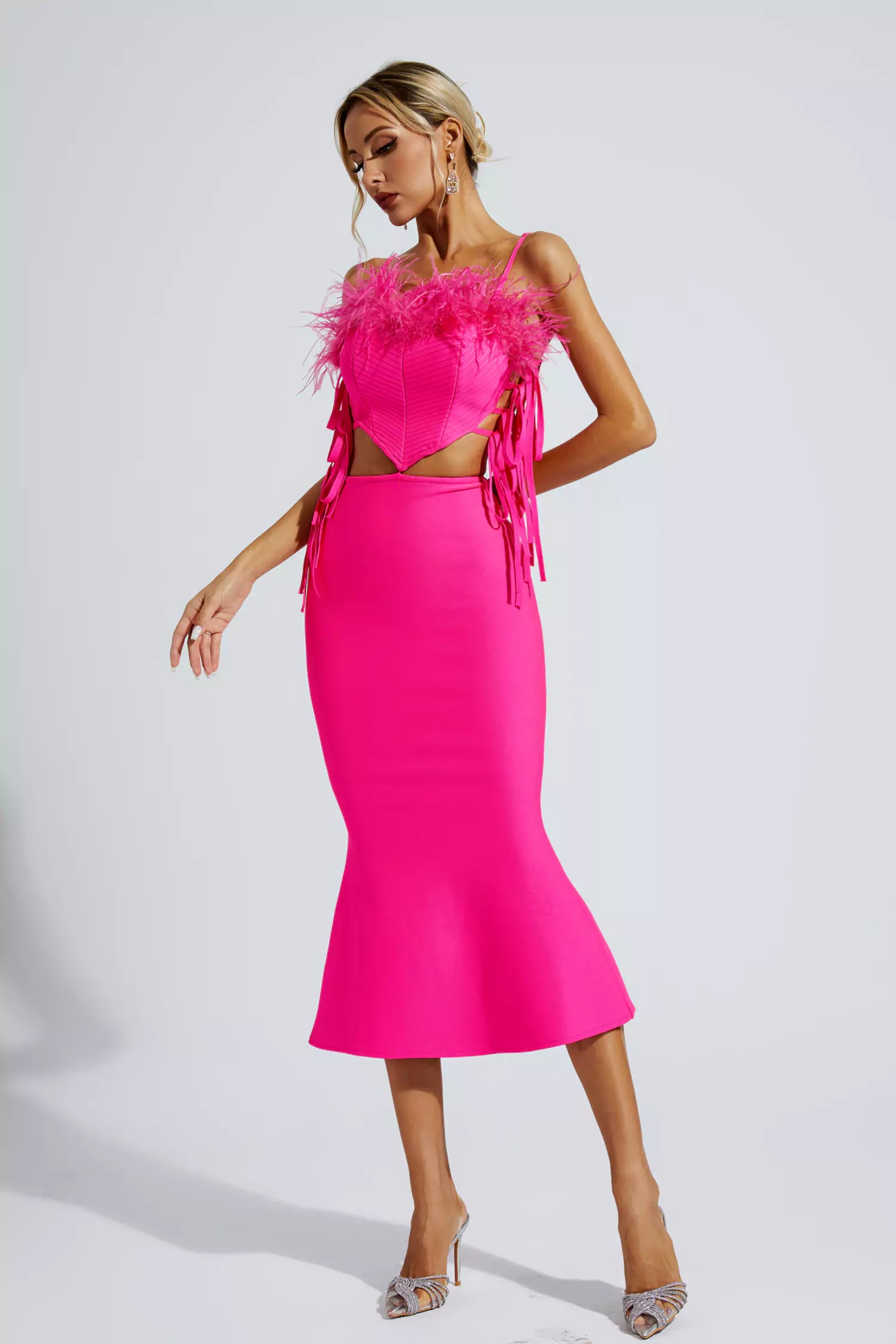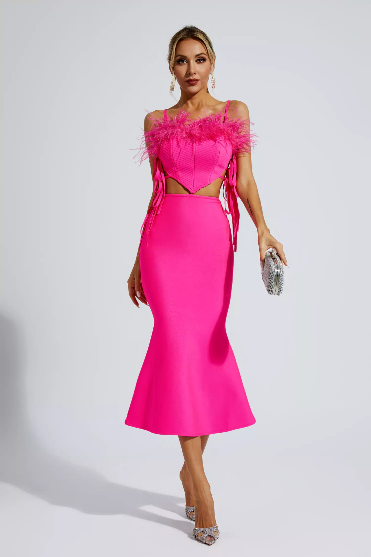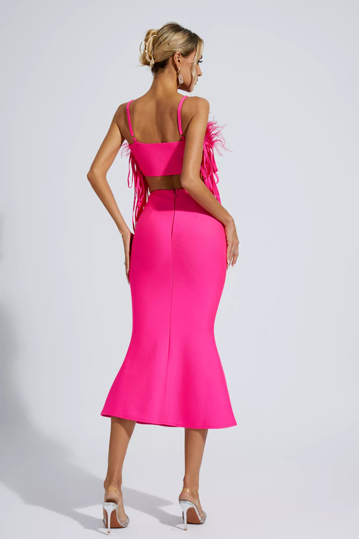 Immerse yourself in the world of Barbie and get compliments from everyone when you wear the Carter Pink Feather Bandage Midi Dress. The smooth ostrich feathers are used as the chest embellishment, and the elastic bandage fabric and the lace-up hollow design can modify the body shape and highlight the waistline. This dress will definitely bring you a sense of fashion like never before!