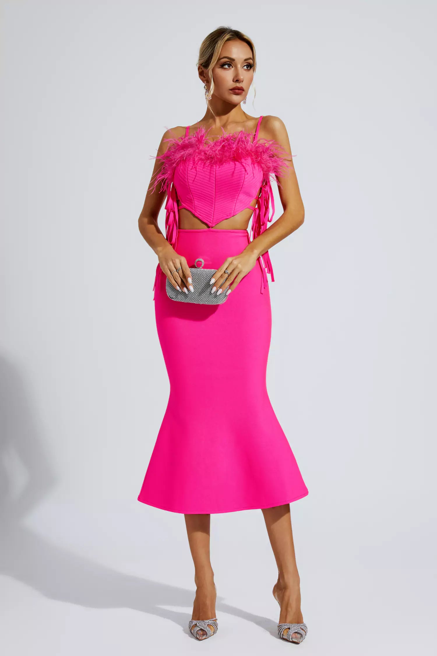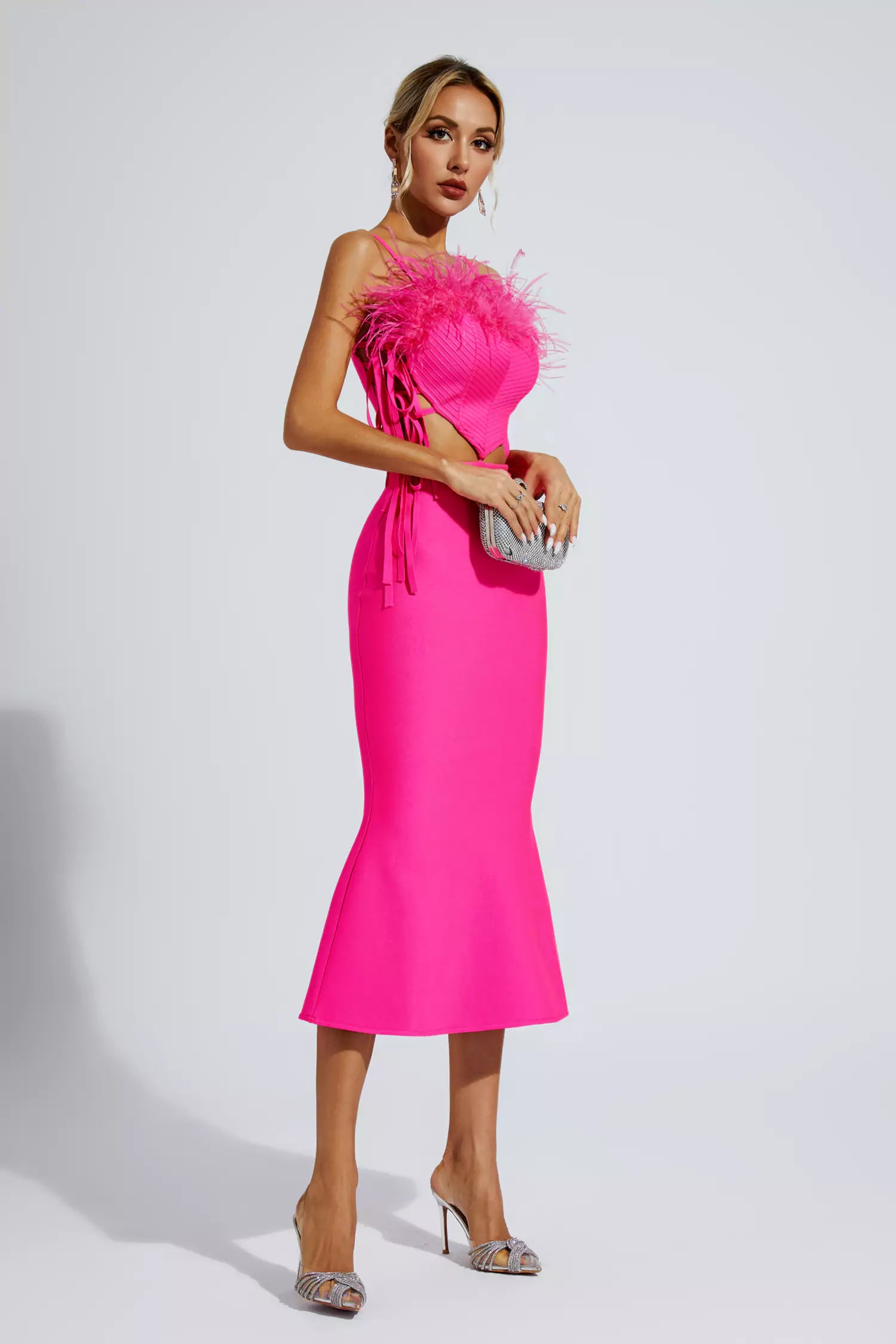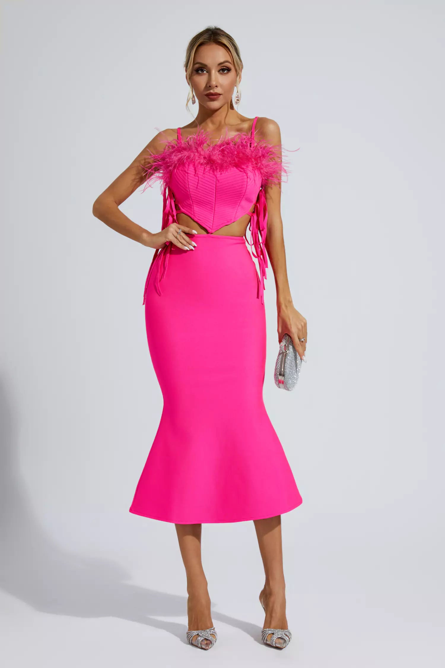 Immerse yourself in the world of Barbie and get compliments from everyone when you wear the Carter Pink Feather Bandage Midi Dress. The smooth ostrich feathers are used as the chest embellishment, and the elastic bandage fabric and the lace-up hollow design can modify the body shape and highlight the waistline. This dress will definitely bring you a sense of fashion like never before!
