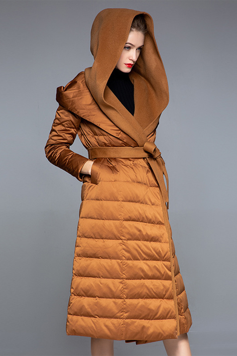 This is a medium to long lace up hooded thick down jacket. Self cultivating commuting style. White duck down filling, with a down content of 86% to 90%, and a down weight of 301-350 grams. Pocket style elegance. There are multiple colors to choose from.