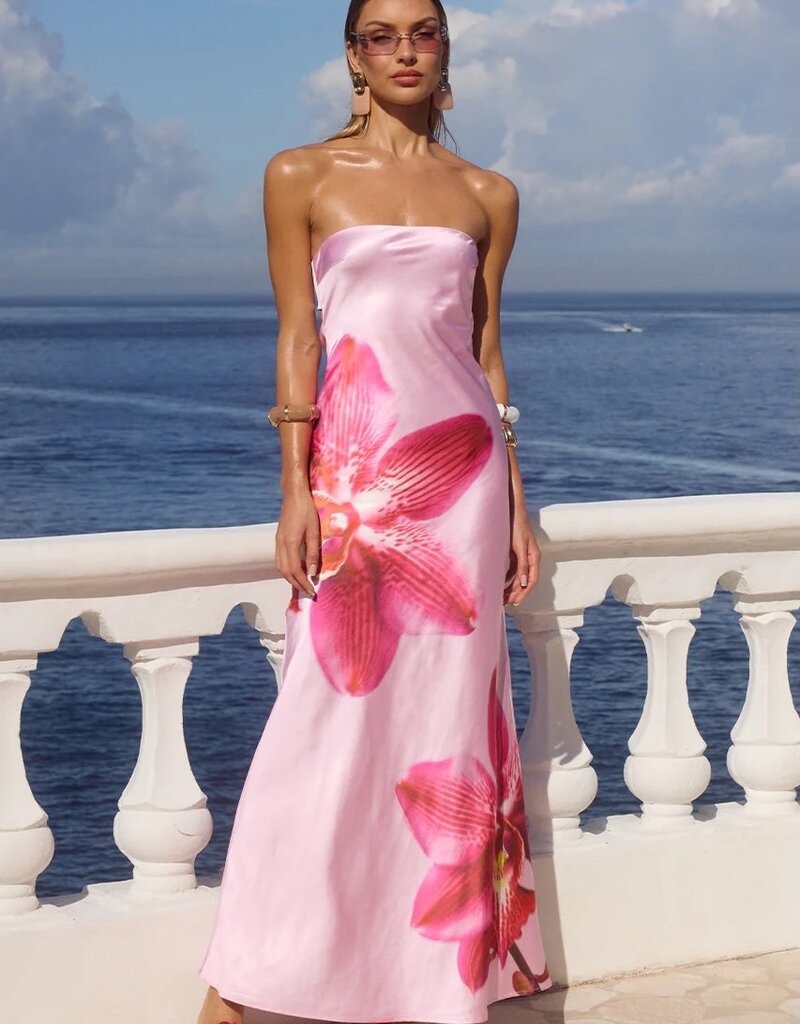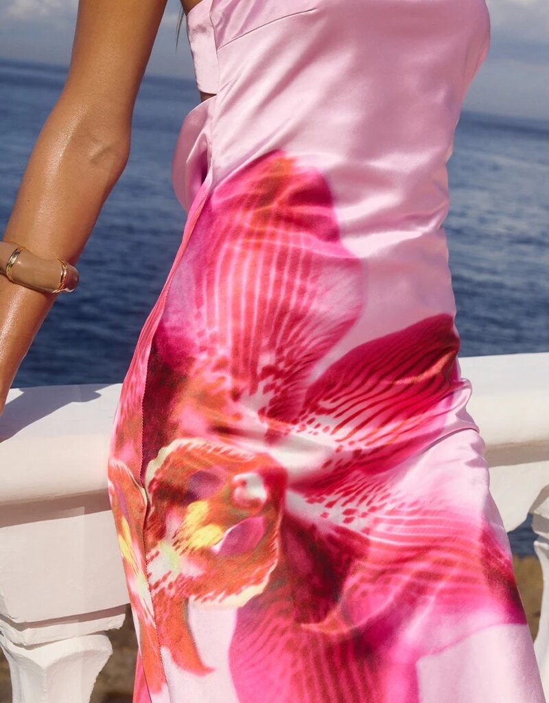 Orchid pink flower print satin strapless maxi dress with open cowl back