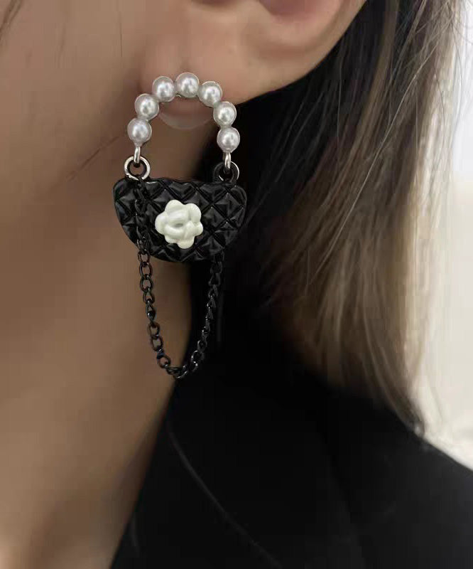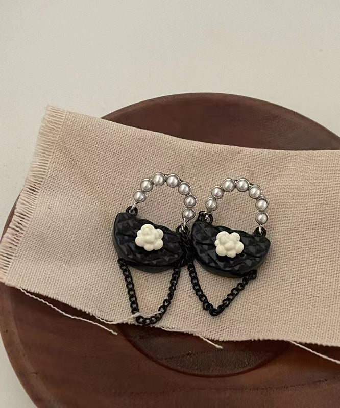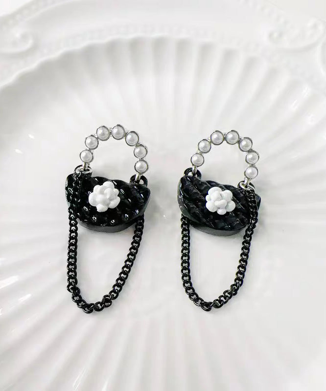 Chic Black Sterling Silver Floral Bag Drop Earrings