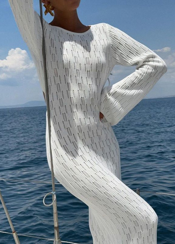 Coastal Allure is a stunning white knit maxi dress designed to make waves. Featuring a form-fitting silhouette with an open back and tie closure, this piece blends sophistication with beach-ready ease. The textured knit pattern adds visual interest while remaining breathable and lightweight — perfect for yacht getaways, coastal walks, or summer evenings.