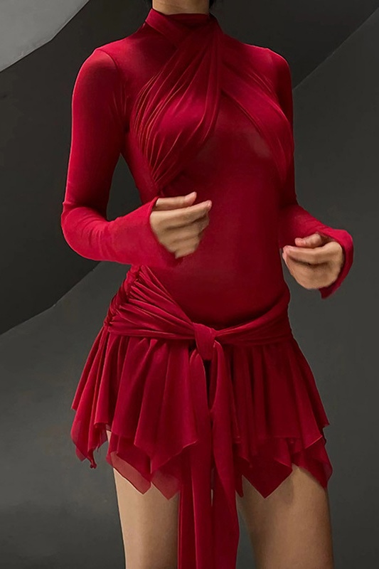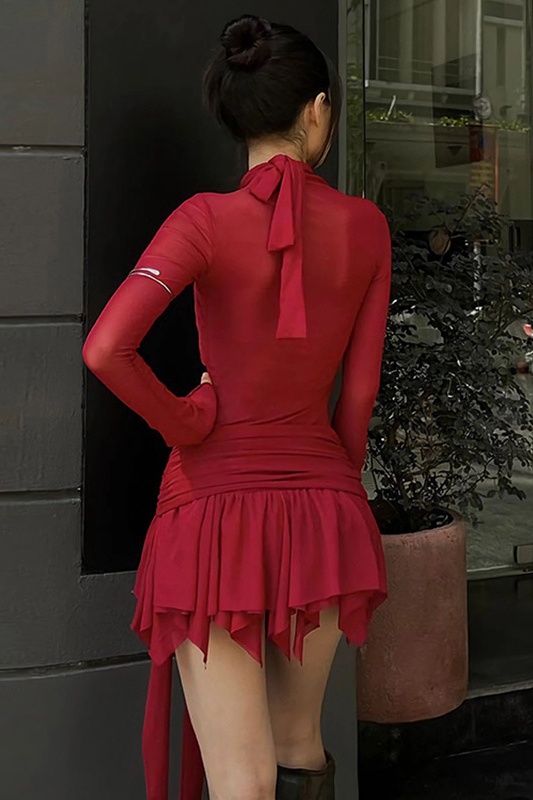 Unleash your inner firecracker with our Cross Body Asymmetry Mini Mesh Dress. Its ravishing red hue, daringly sheer mesh, and knotted hip line exude confidence and allure. The cross body straps and flared hem add an audaciously unique touch, while the balletcore aesthetic sets you apart from the crowd. Be bold, be fearless, be unforgettable.