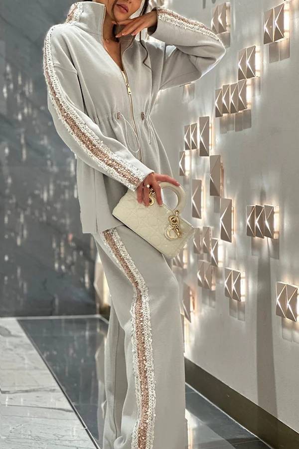 Edan Textured Knit Sequin Patchwork Drawstring Zipper Sweatshirt and Stretch Wide Leg Pants Set