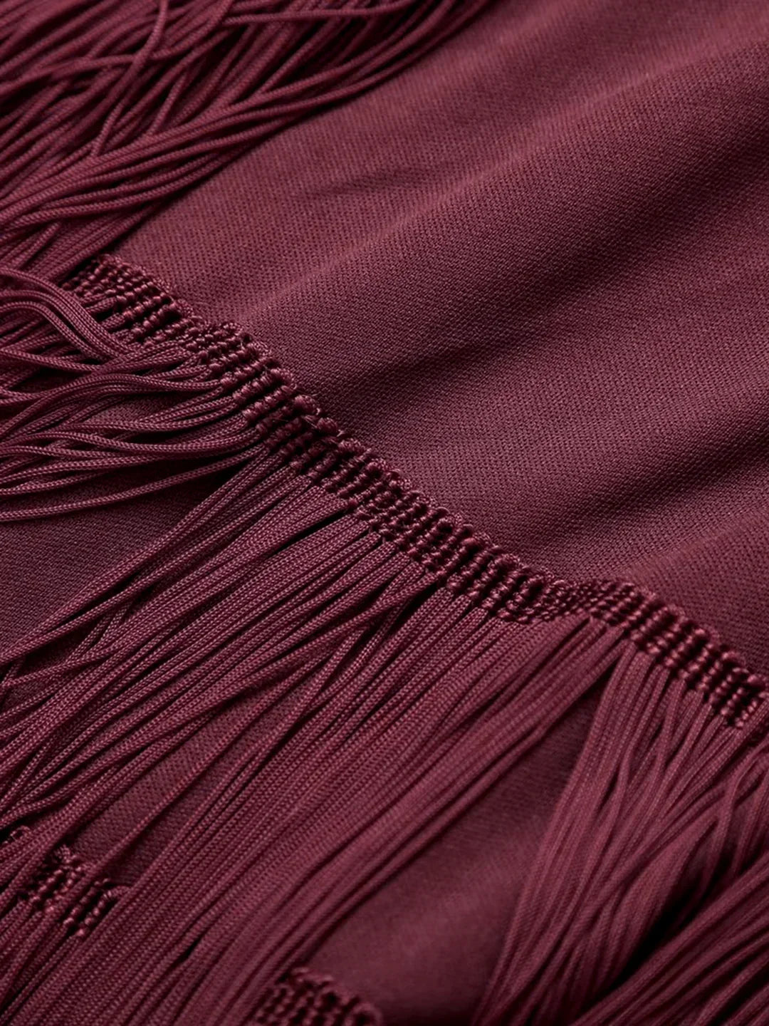 Design: An eye-catching blend of flirt and finesse, this short dress features delicately placed fringe accents and an open-back silhouette for a bold yet refined look. The high neckline offers balance to the dramatic back, while the movement-friendly fringe adds charm with every step.