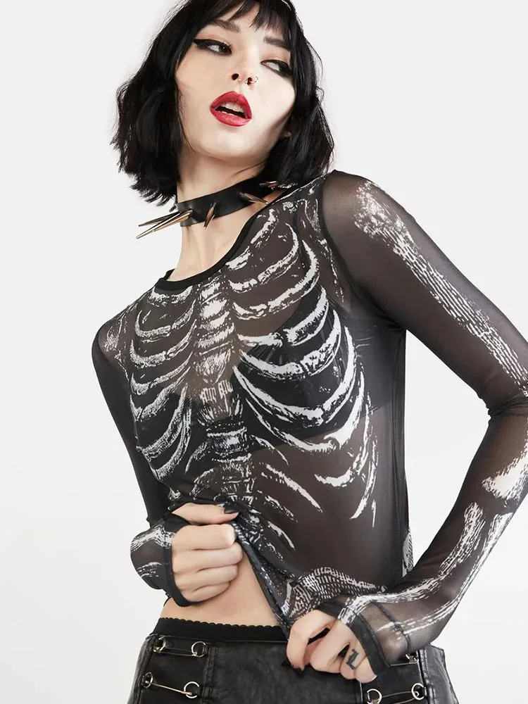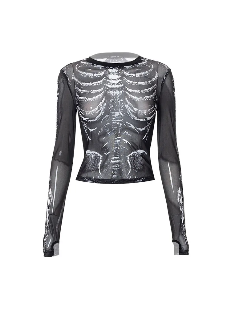Gothic Punk Shirt 2000s Women Skeleton Pattern Round Neck Long Sleeve Crop Top Black Dark Academia Clothes y2k Tees Streetwear