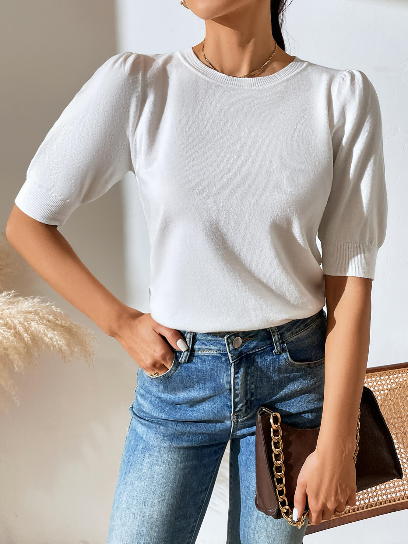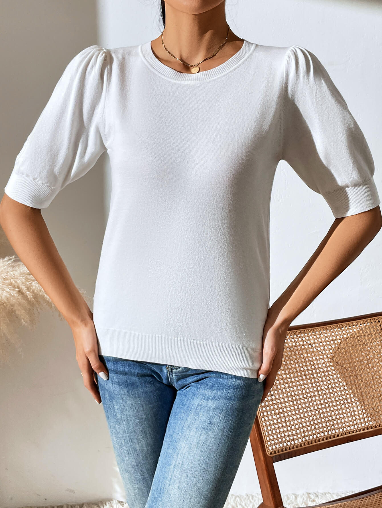 Our Halo_Cotton Blend_knit top_made from a soft and breathable blend of cotton and synthetic fibers, this top is the epitome of comfort and style. The short sleeves make it perfect for warmer weather, while the knit fabric adds a touch of sophistication to your look. The flattering cut of the top is designed to complement your figure and enhance your natural curves.