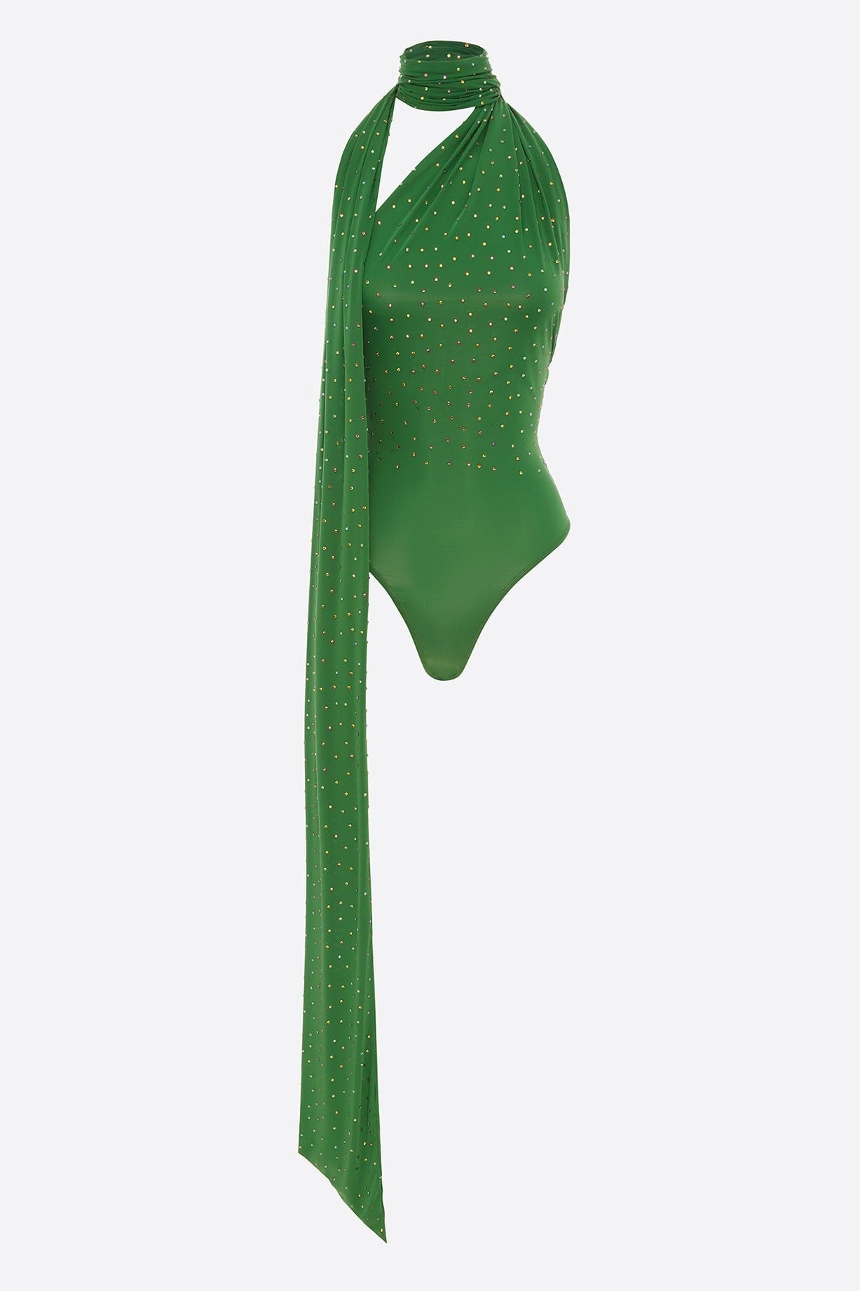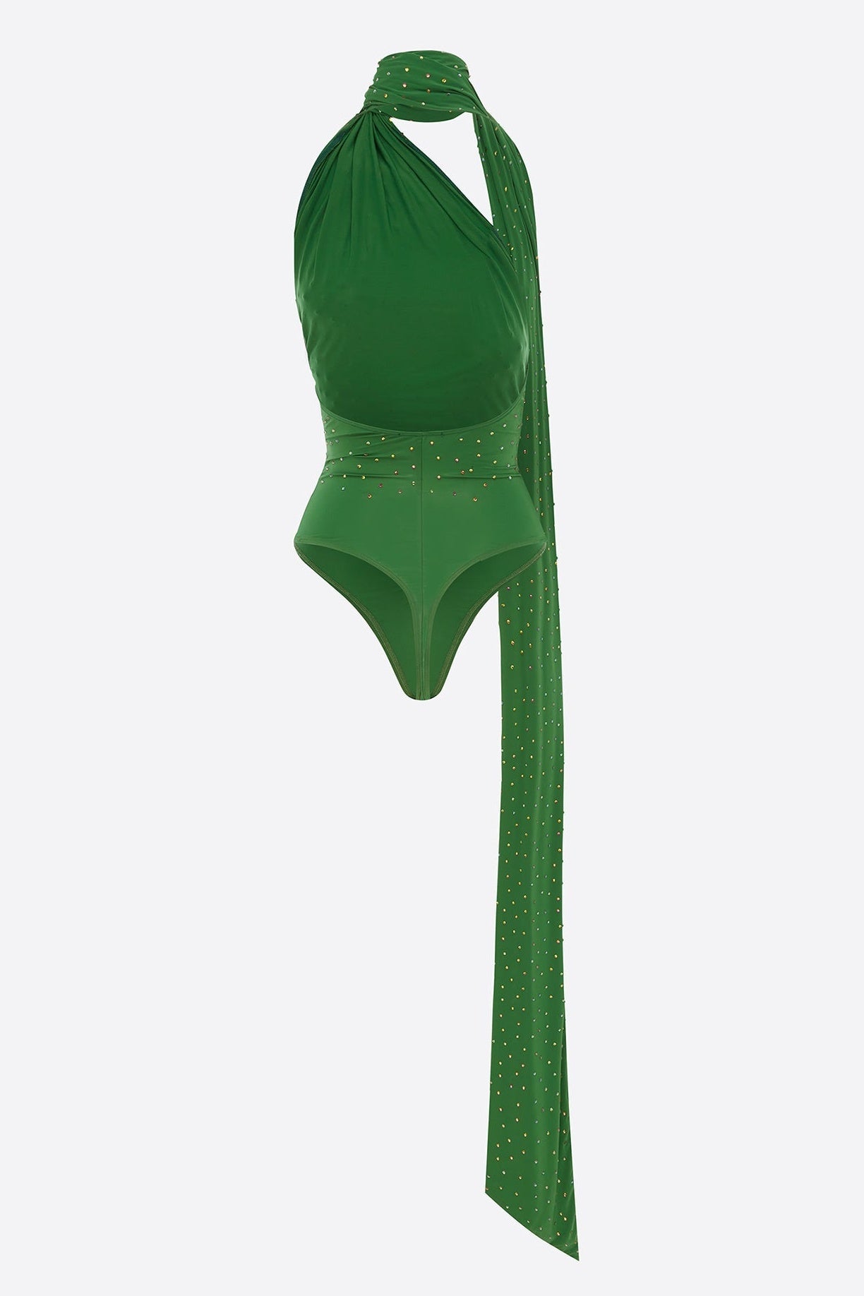 Effortlessly chic and luxurious, the Haymita Crystal Scarf Wrap Bodysuit Two Piece Set is a must-have for any fashion lover. With a crystal-embellished scarf wrap bodysuit and a ruched skirt, this set exudes sophistication and exclusivity. Make a statement and elevate your wardrobe with this stunning two piece set.