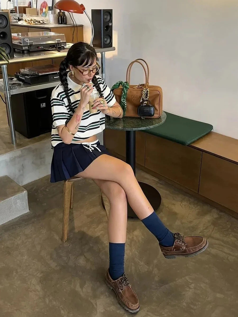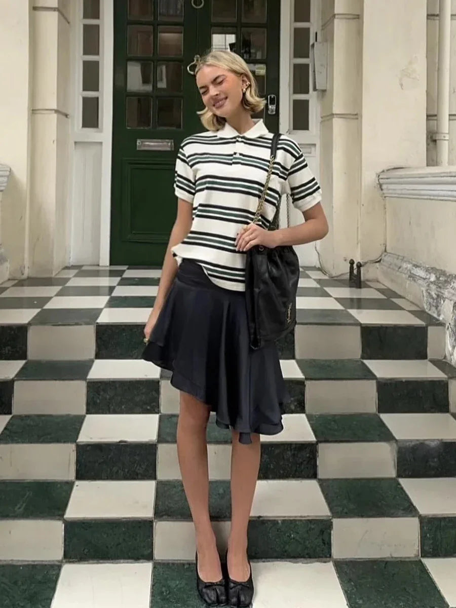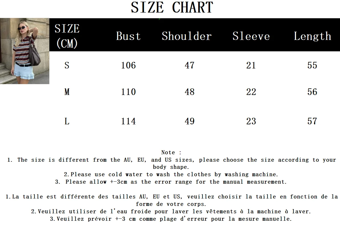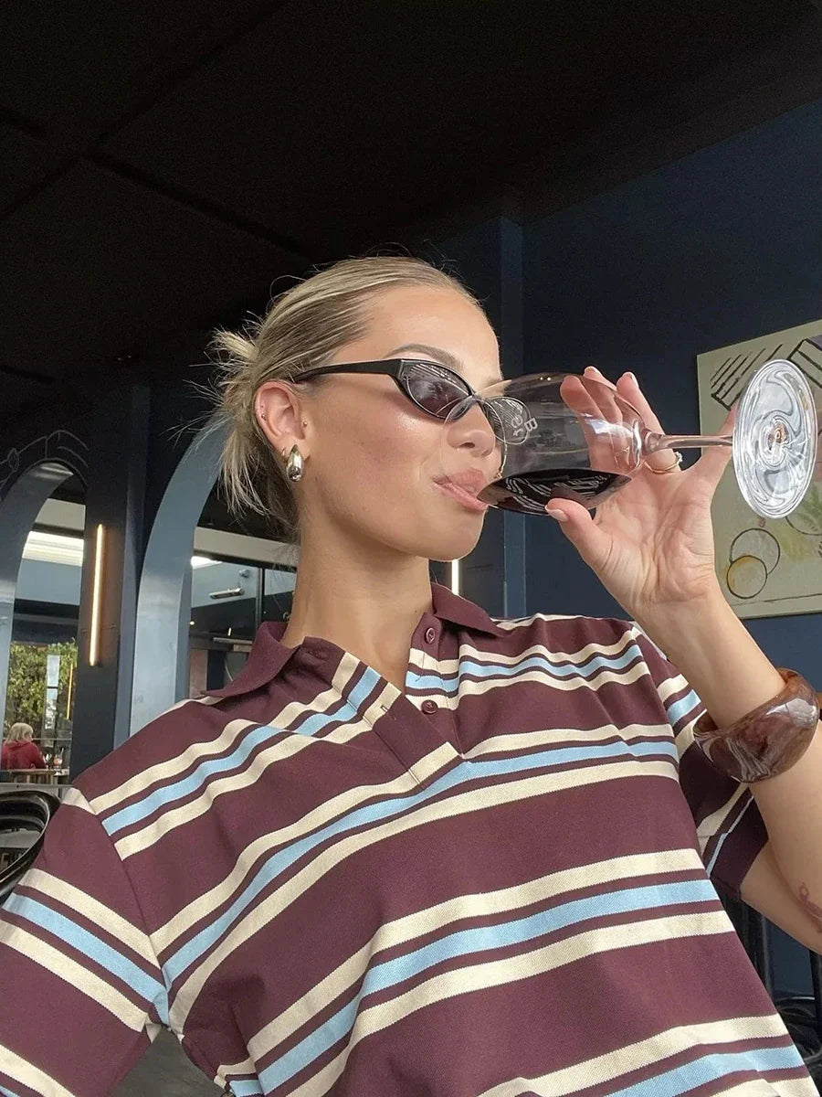 Striped Contrast Short Sleeve T-shirt Women Buttons Turndown Collar Tee Shirt Spring New Streetwear Vintage Chic Top Tees 2025