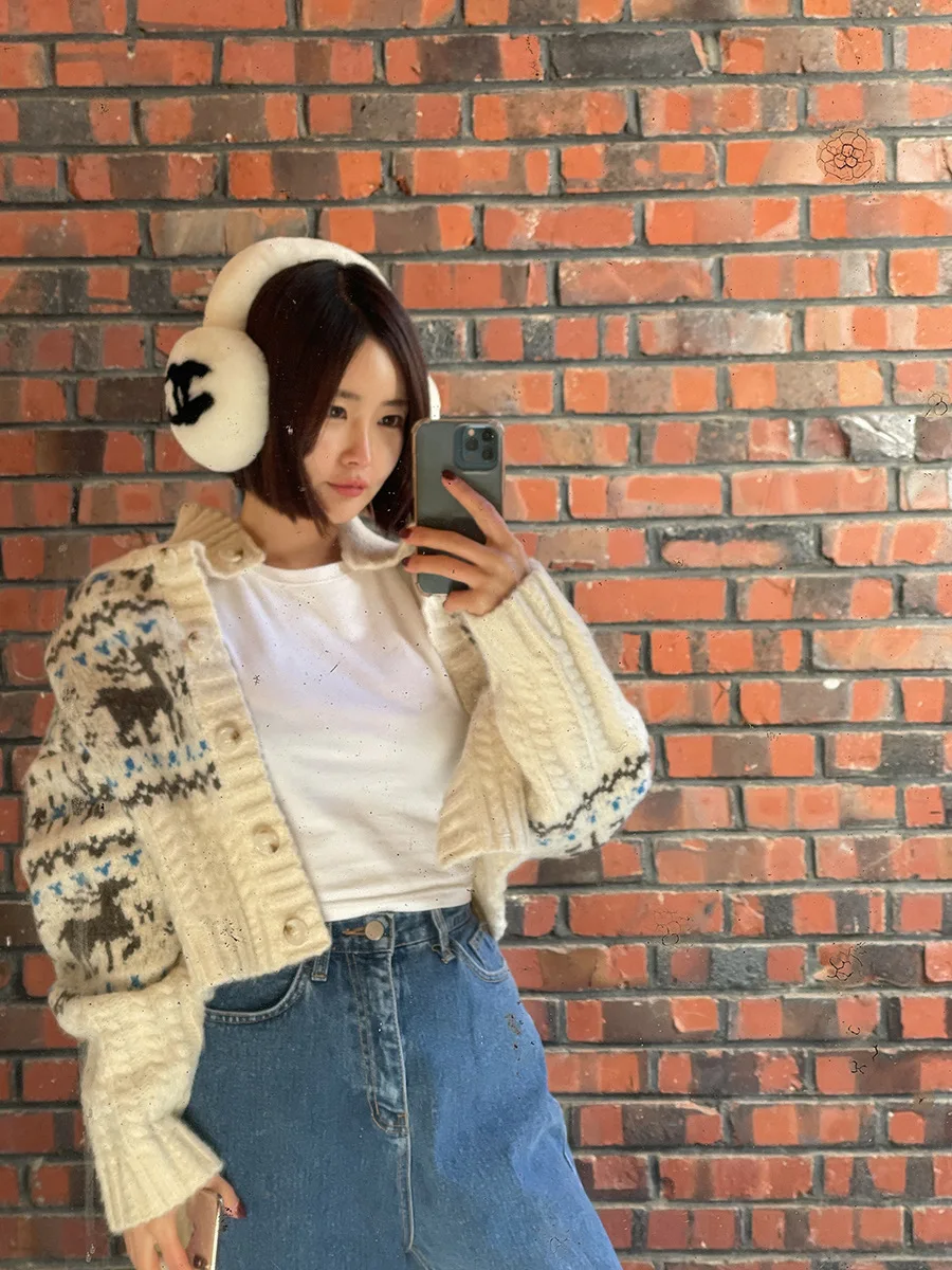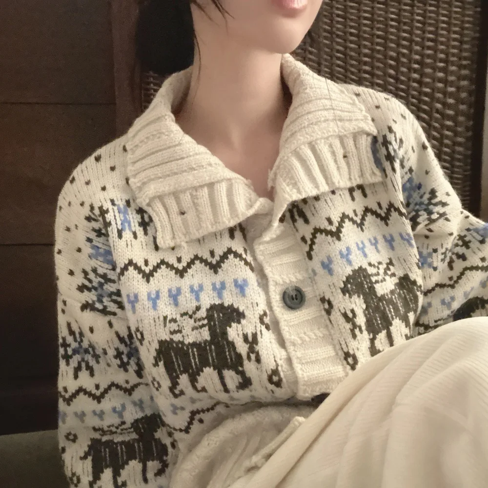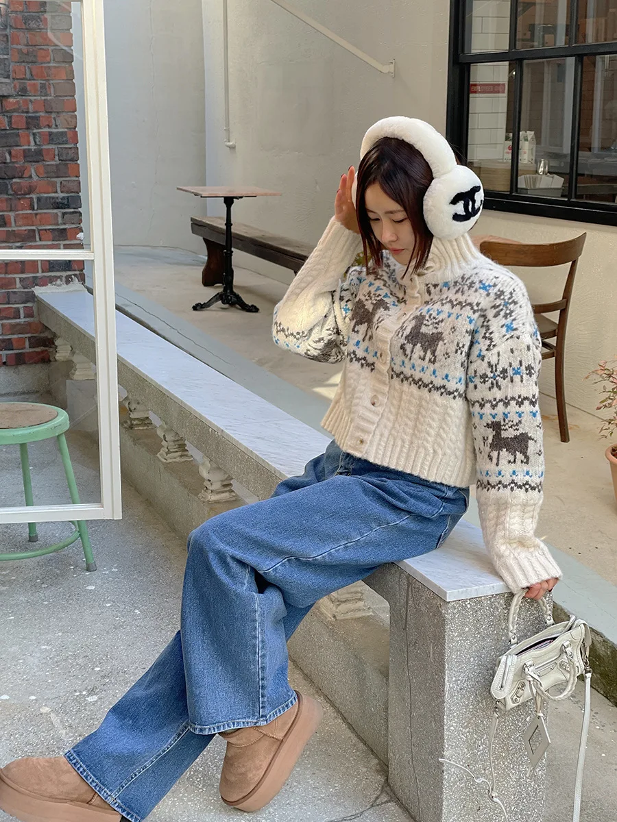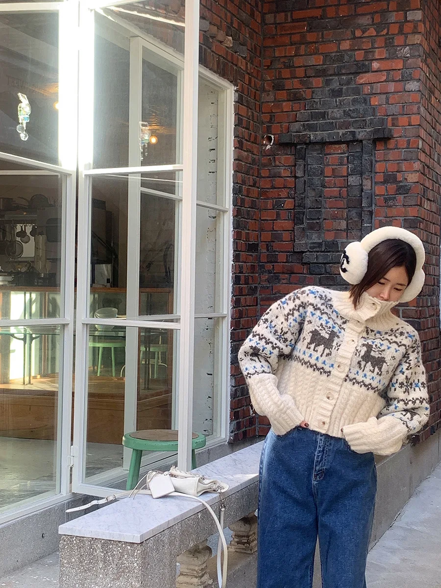 Retro Gentle Style Stand Collar Single Breasted Christmas Knitted Top Elk Jacquard Long Sleeve Sweater Jacket Cropped Cardigan