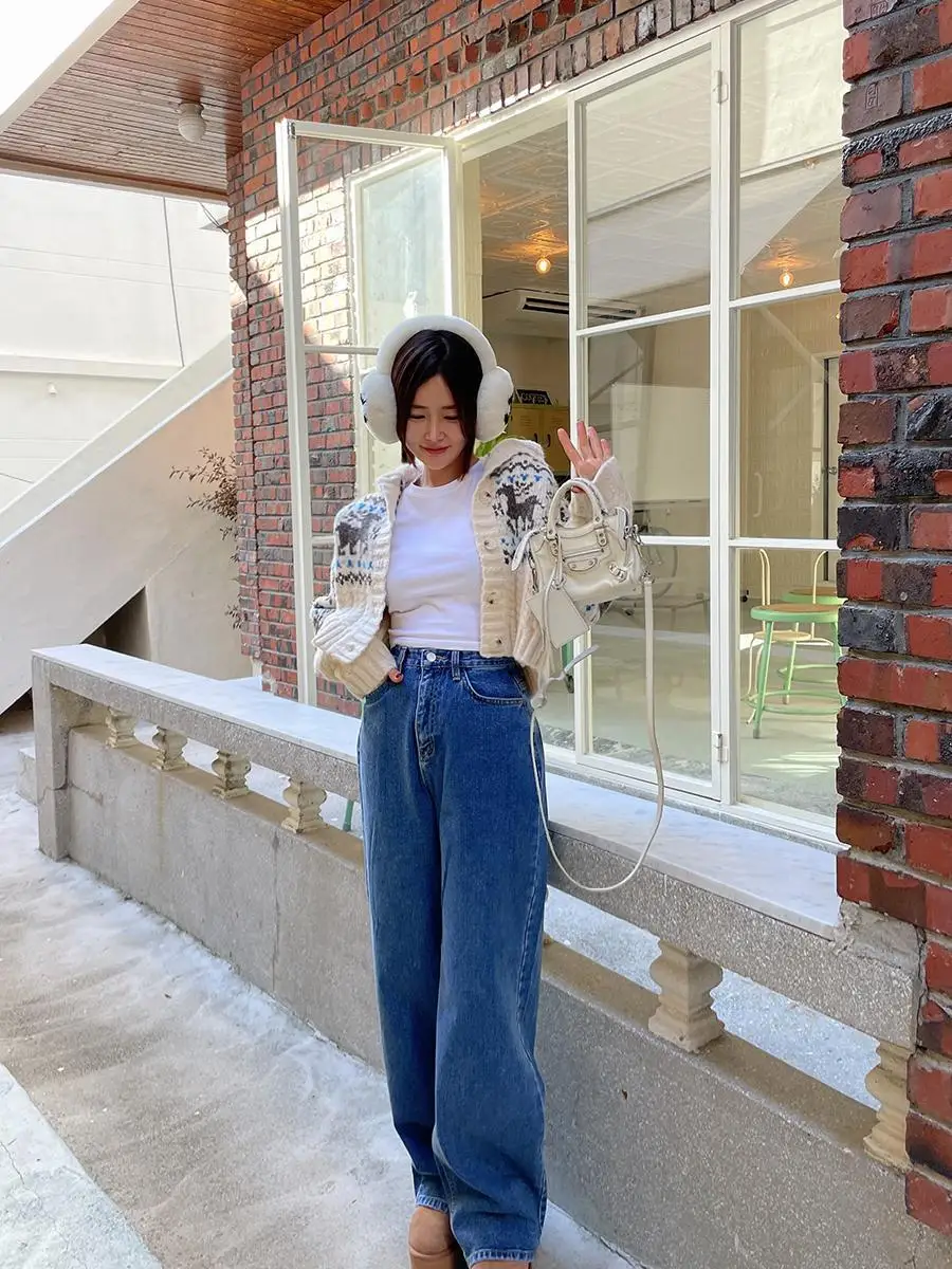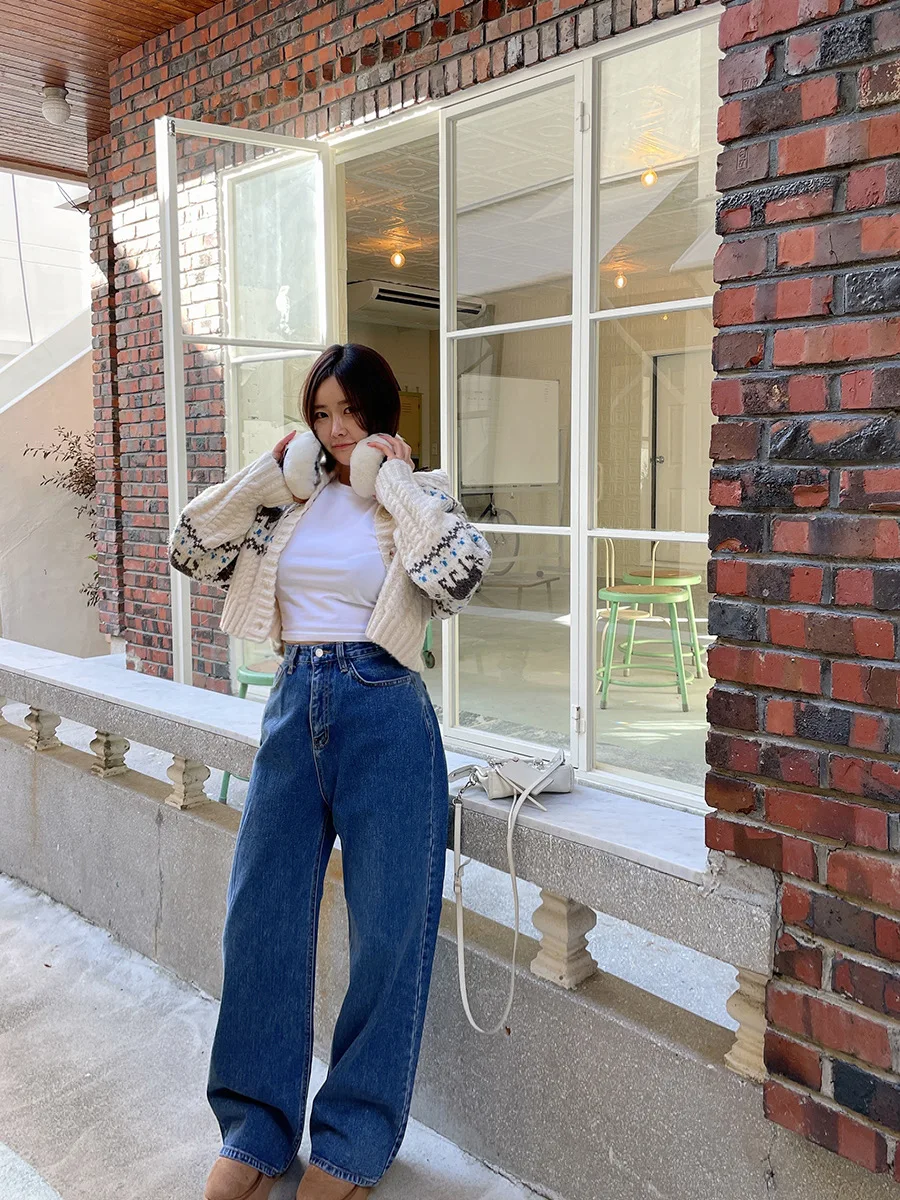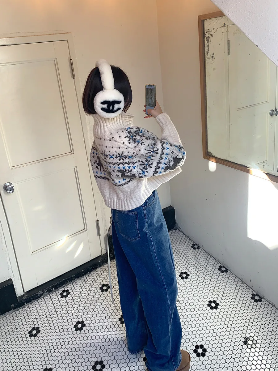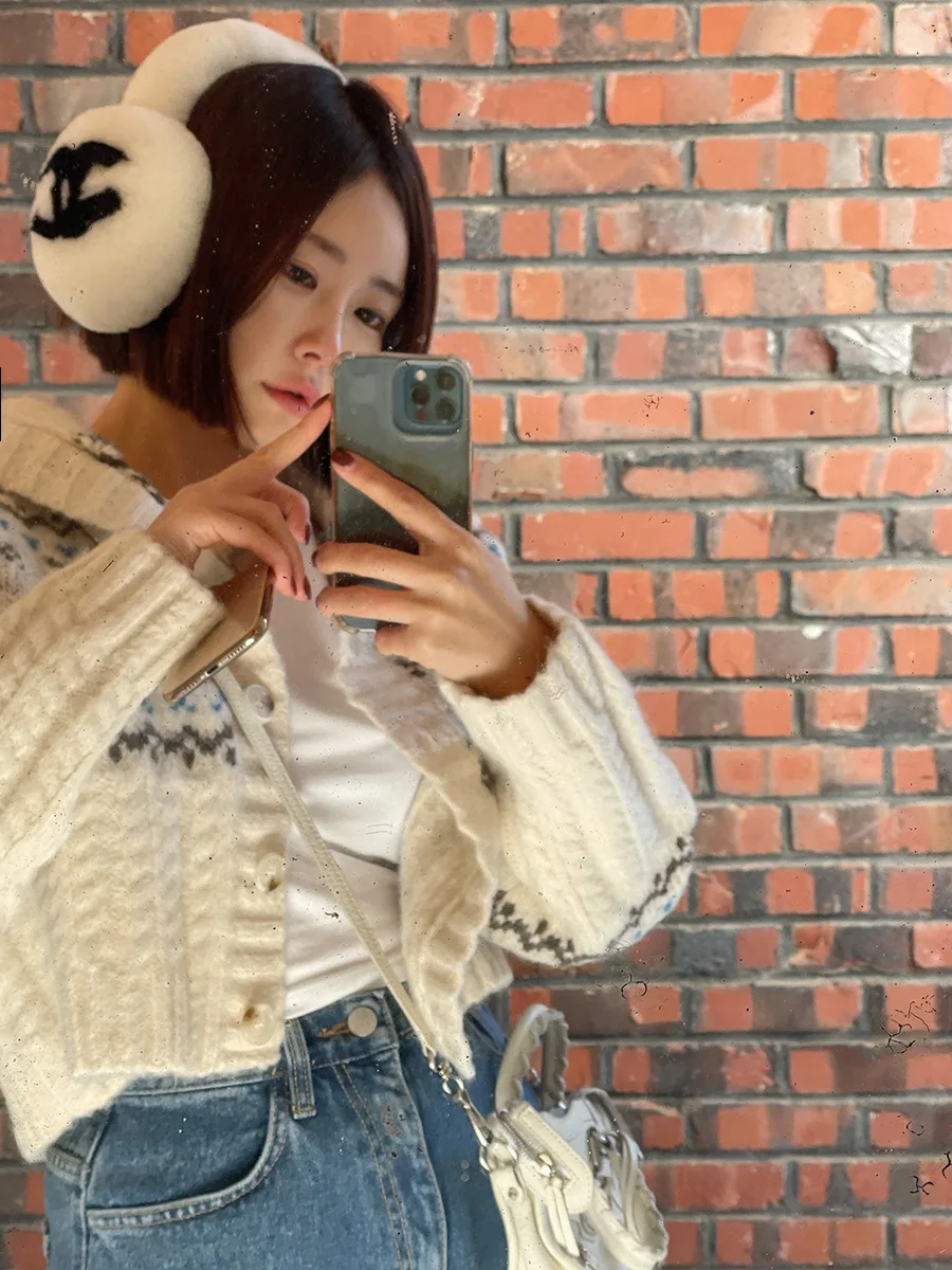 Retro Gentle Style Stand Collar Single Breasted Christmas Knitted Top Elk Jacquard Long Sleeve Sweater Jacket Cropped Cardigan