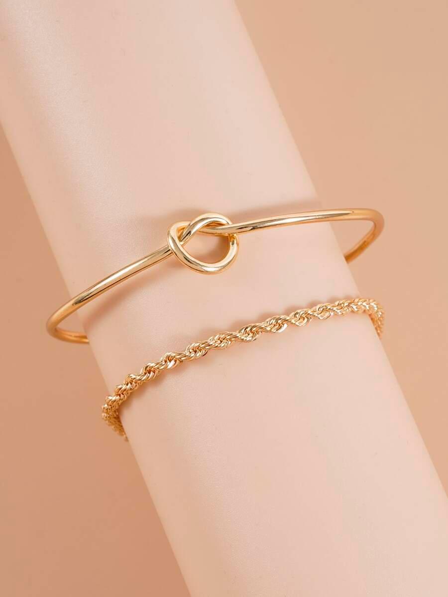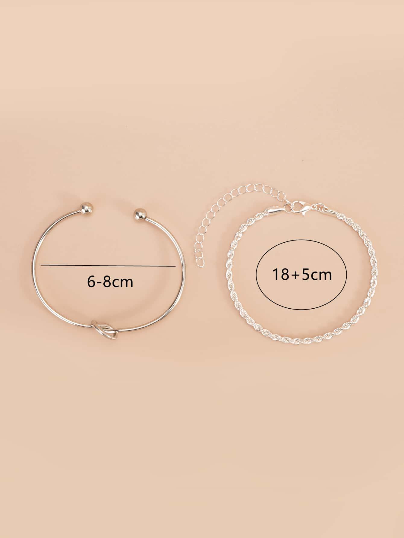 Design: The Knot Detail Twist Bracelet Set in silver-tone metal features a refined two-piece duo—one sleek twisted bangle and one knot-accent cuff—that layers effortlessly for a coordinated, modern look. The knot motif and subtle twist create a timeless silhouette that elevates both casual and curated outfits with understated luxury.