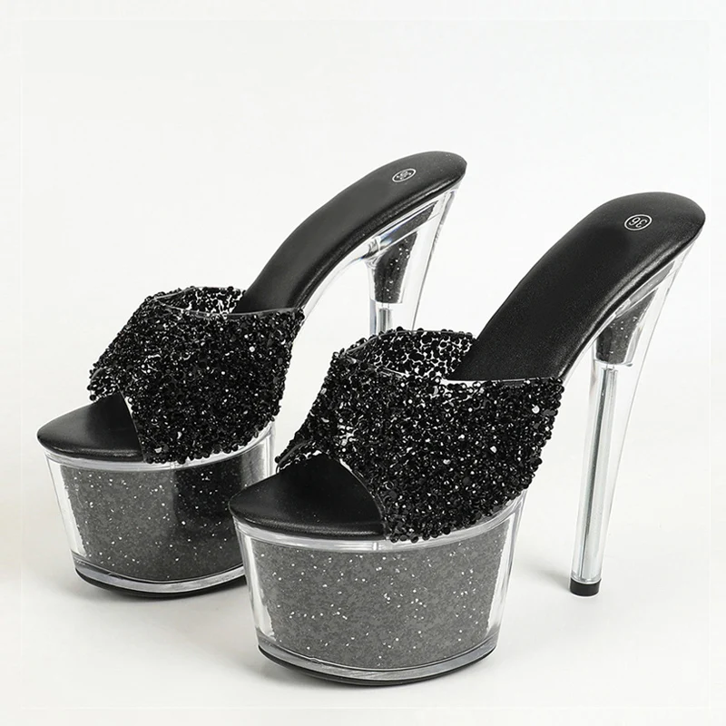 Crafted with meticulous attention to detail, these slipper-style sandals feature a sequined transparent platform that adds a touch of sparkle and sophistication. The peep toe design adds a hint of playfulness, while the sky-high heels elongate your legs and enhance your posture.