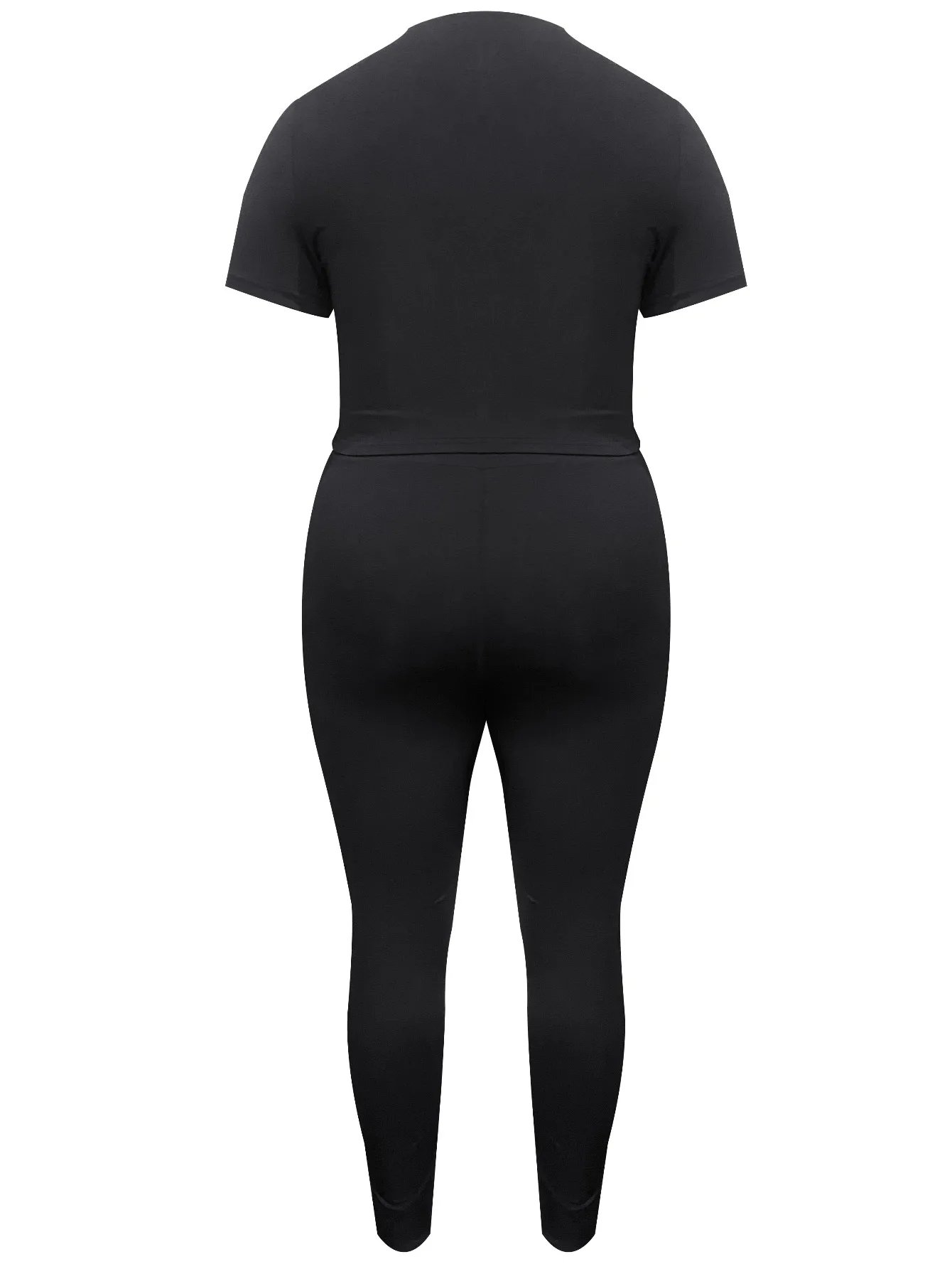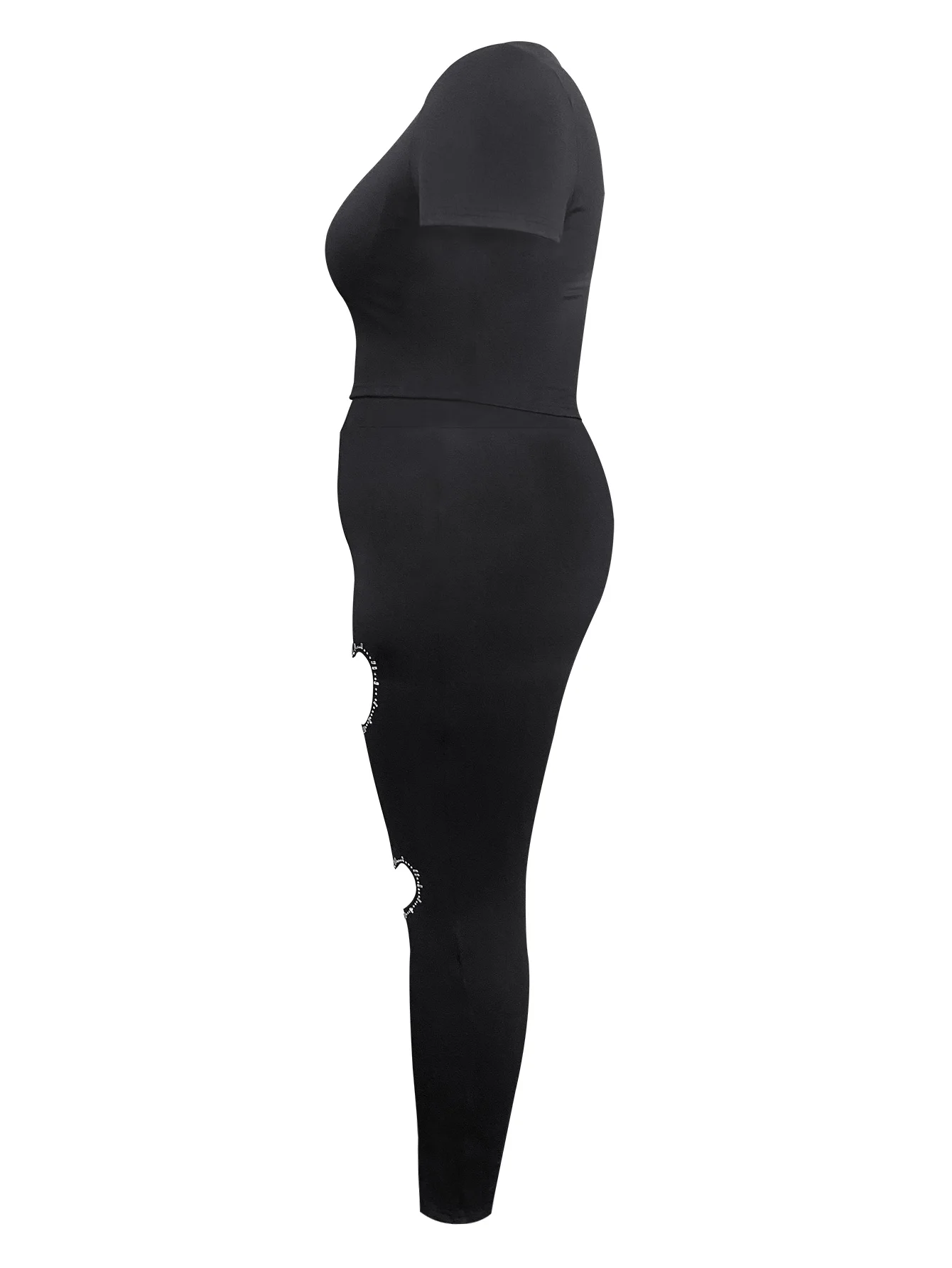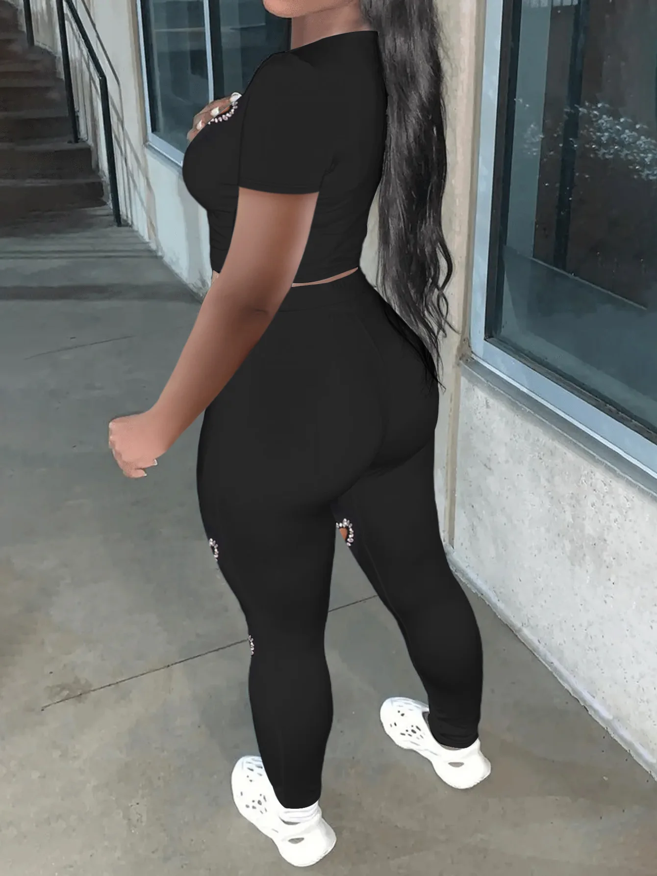 Plus Size Crop Top Rhinestone Heart Decor Pants Set Women Sexy Skinny Two-Pieces Suit Short Sleeve Top Trousers Set