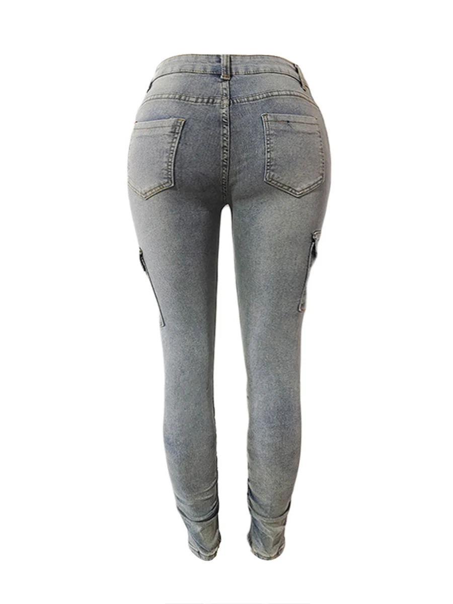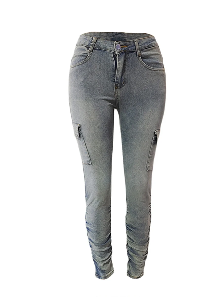 Plus Size High Waist Side Flap Pocket Cargo Jeans Women Zipper Ruched Design Skinny Trouser