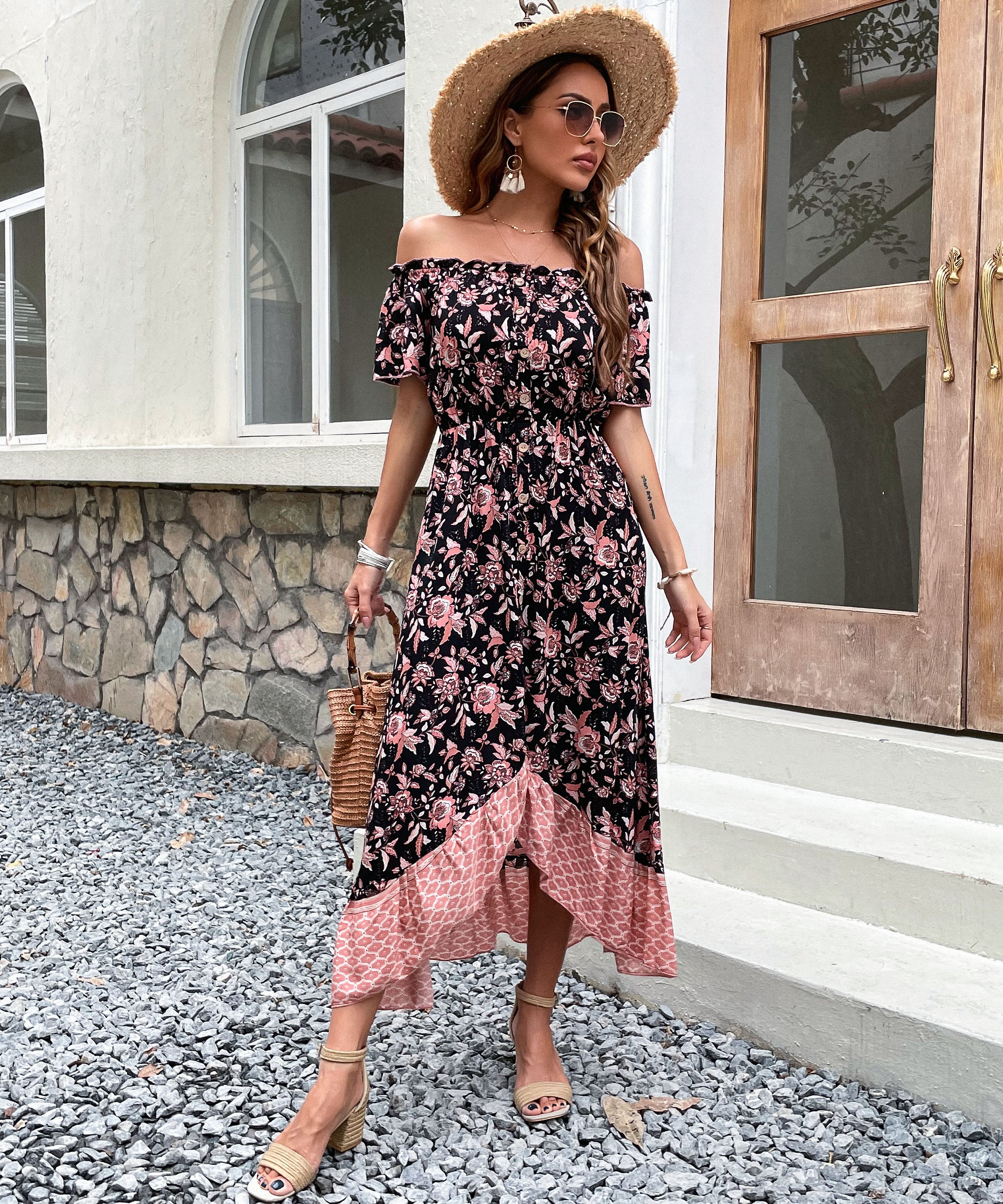 Our_Lyrebird Dress is a standout black tone base with pink_print in a relaxed strapless fit perfect for summer! The shirred bust is comfortable and moulds to the bod beautifully. Paired perfectly with our signature sandals, this midi makes for a stunning_summer seasonal piece!