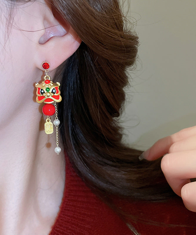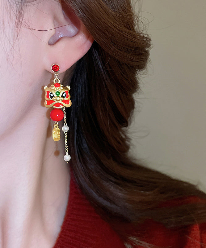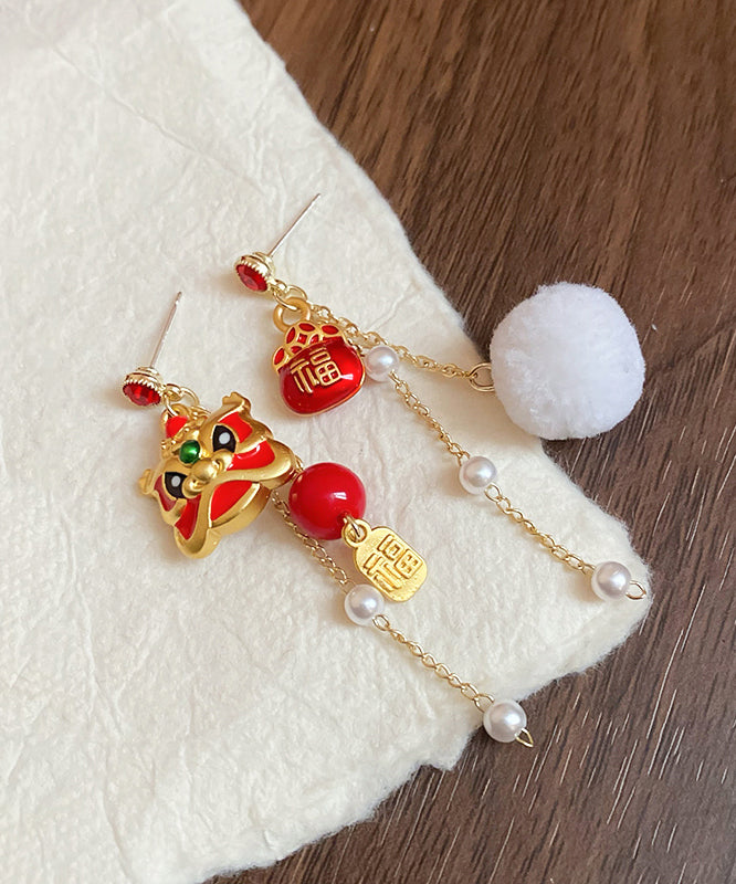 New Red Alloy Zircon Pearl Lion Dance Blessing Bag Tassel Drop Earrings