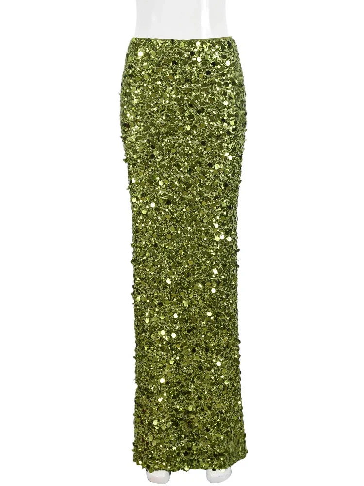 Fashion Glitter Sequin Maxi Skirt For Women Slim Patchwork Sexy Party Looks Solid Shiny Metallic Luxury Ladies Long Skirt