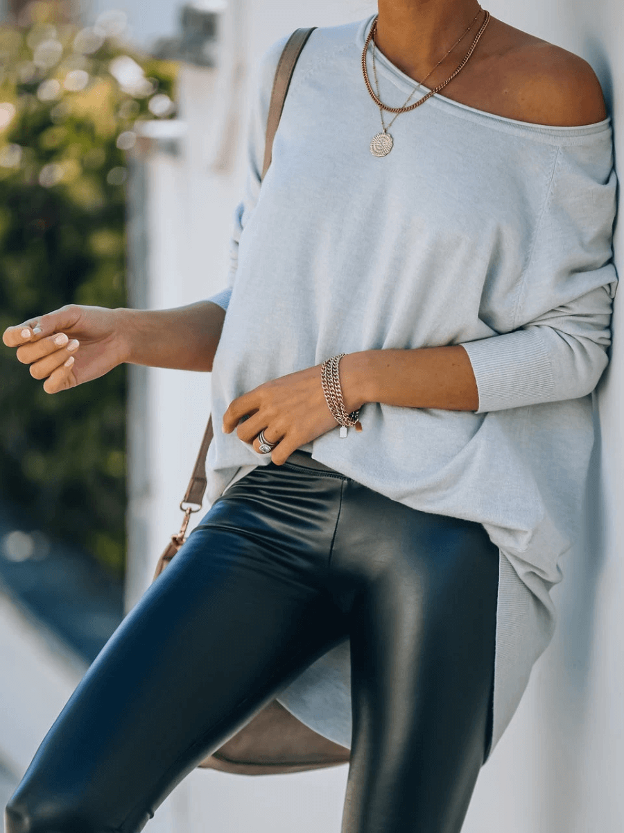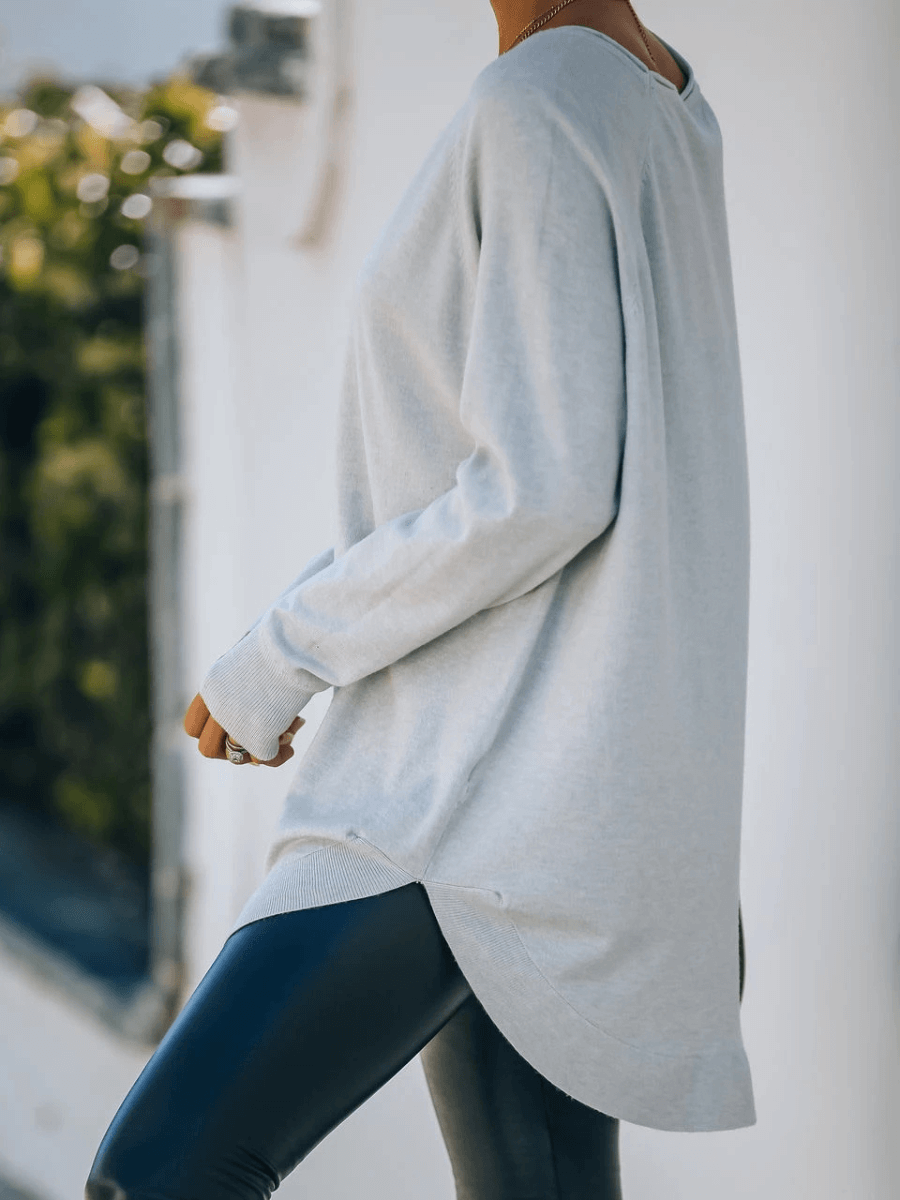 Our_down sweater is oversized collared down Knit_top_in_stone blue tone is detailed with front_short and long back design!