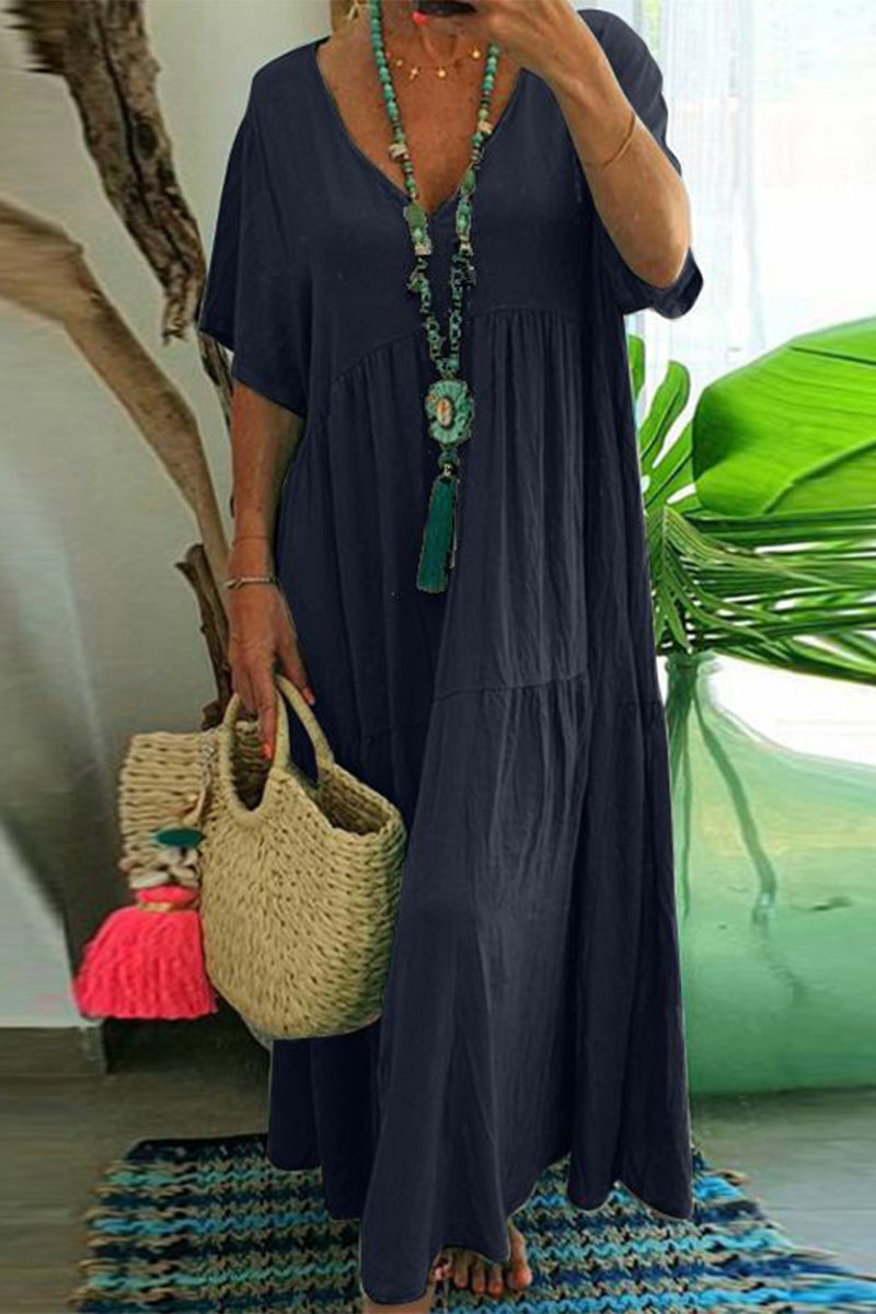 Plus Size Casual College Solid Asymmetrical V Neck Short Sleeve Dress(4 Colors)