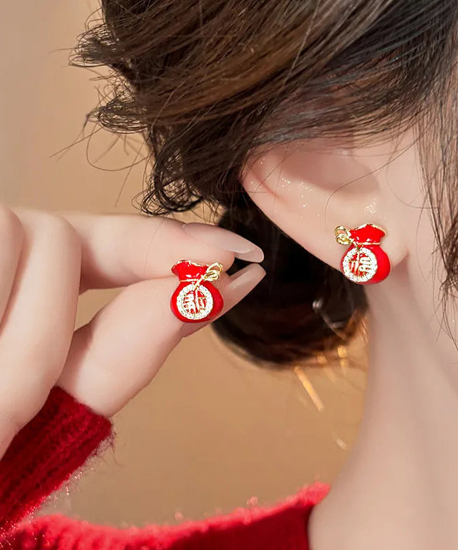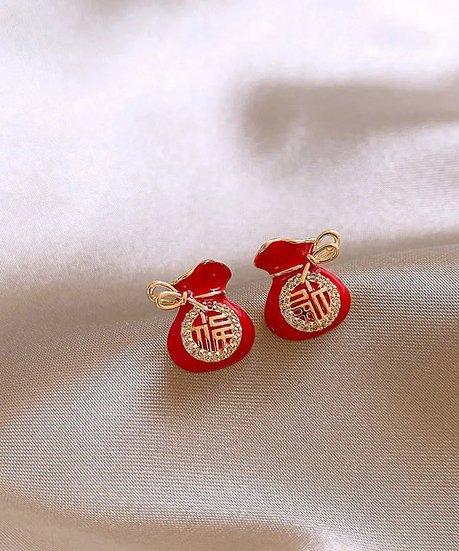 Retro Red Copper Zircon Blessing Bag Stud Earrings