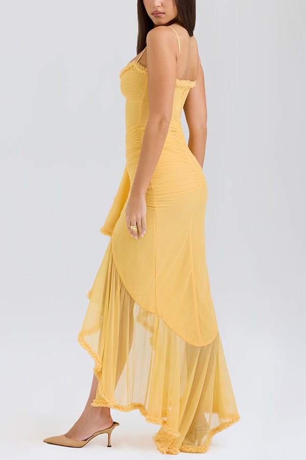 Retro Romantic Style Mesh Ruffle Trim Ruched Slit High Low Maxi Dress