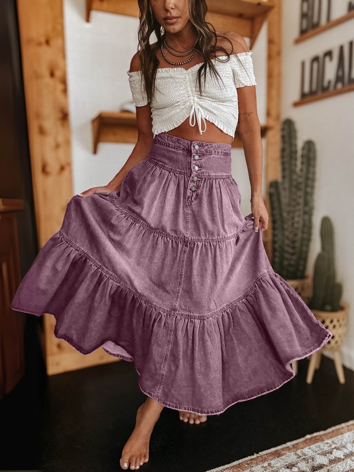 Introducing the Sandie Tiered Denim Maxi Skirt - a stylish and versatile addition to your wardrobe! This denim skirt features unique tiered layers for a playful and trendy look. Perfect for dressing up or down, it's a must-have for any fashion-forward individual. Upgrade your outfit game with the Sandie Tiered Denim Maxi Skirt!