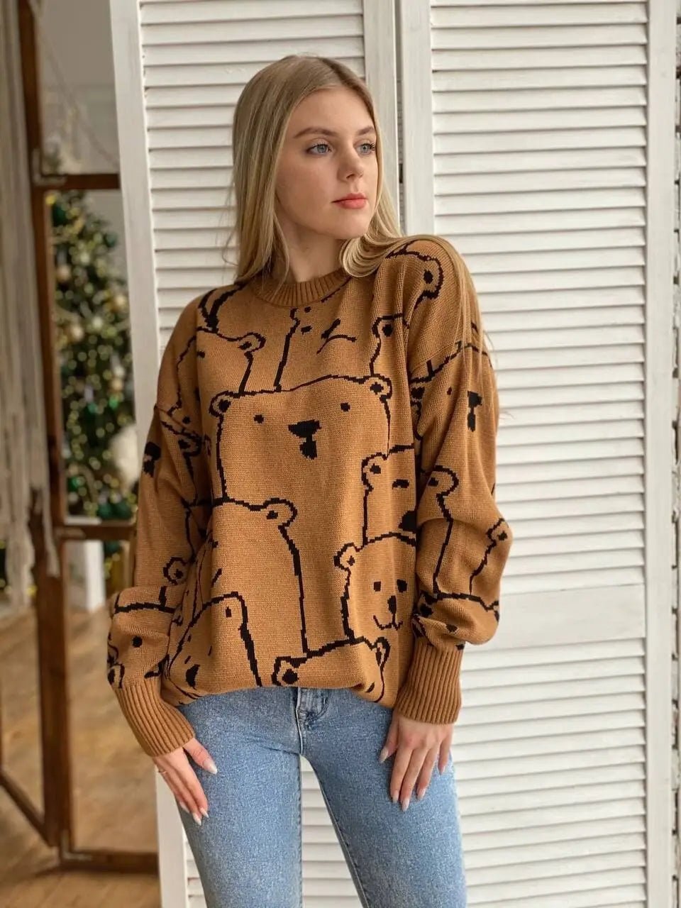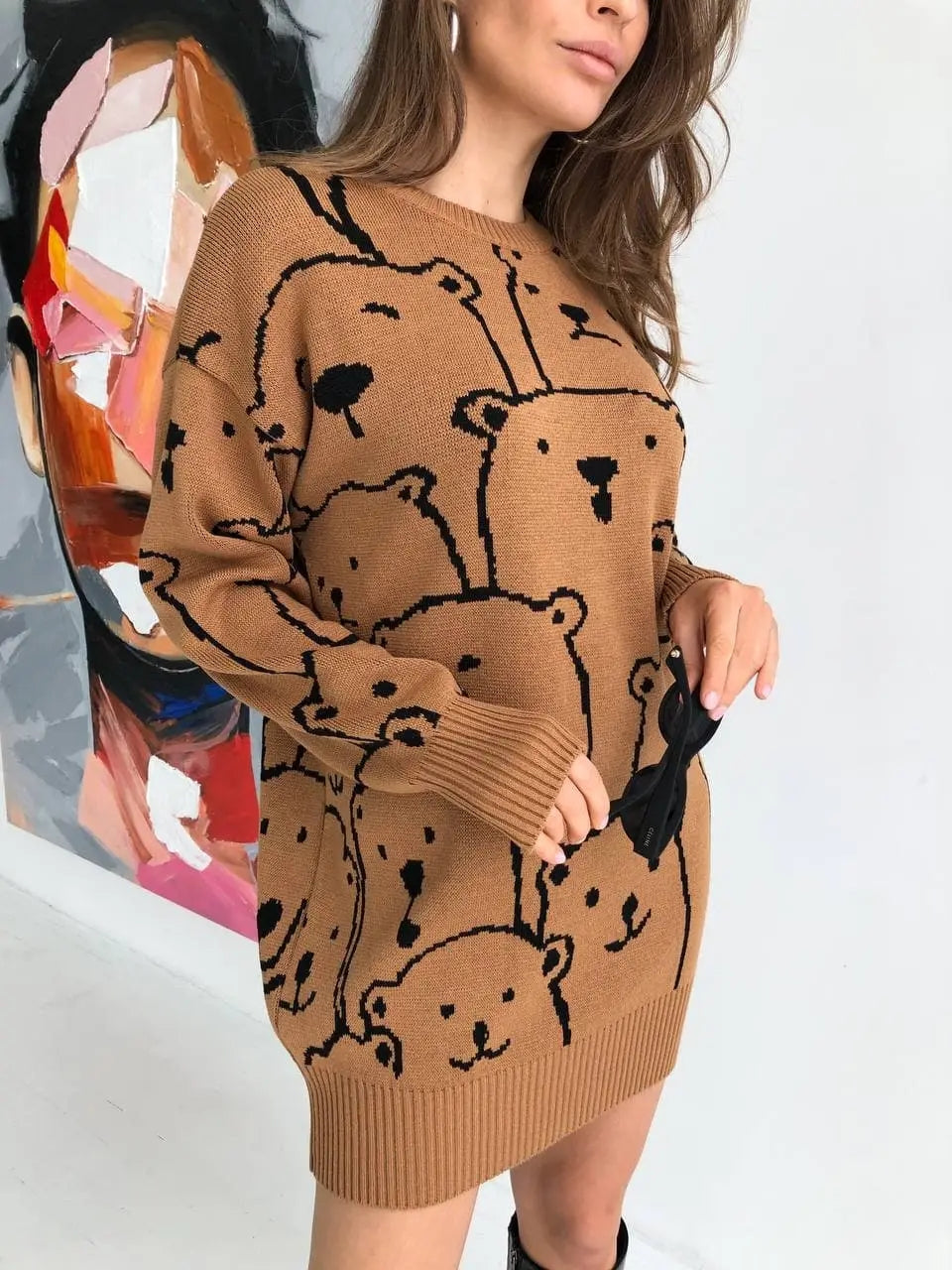 This_cute_knitwear_features a_crew neckline and can be_worn as jumper or dress when leave full length._This_cute cartoon bear print_silhouette is perfect for the holiday season.