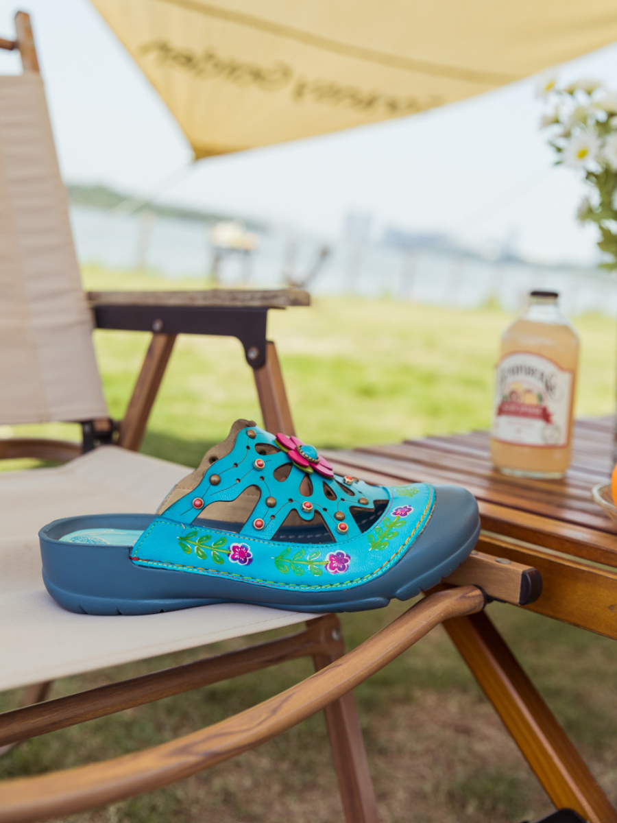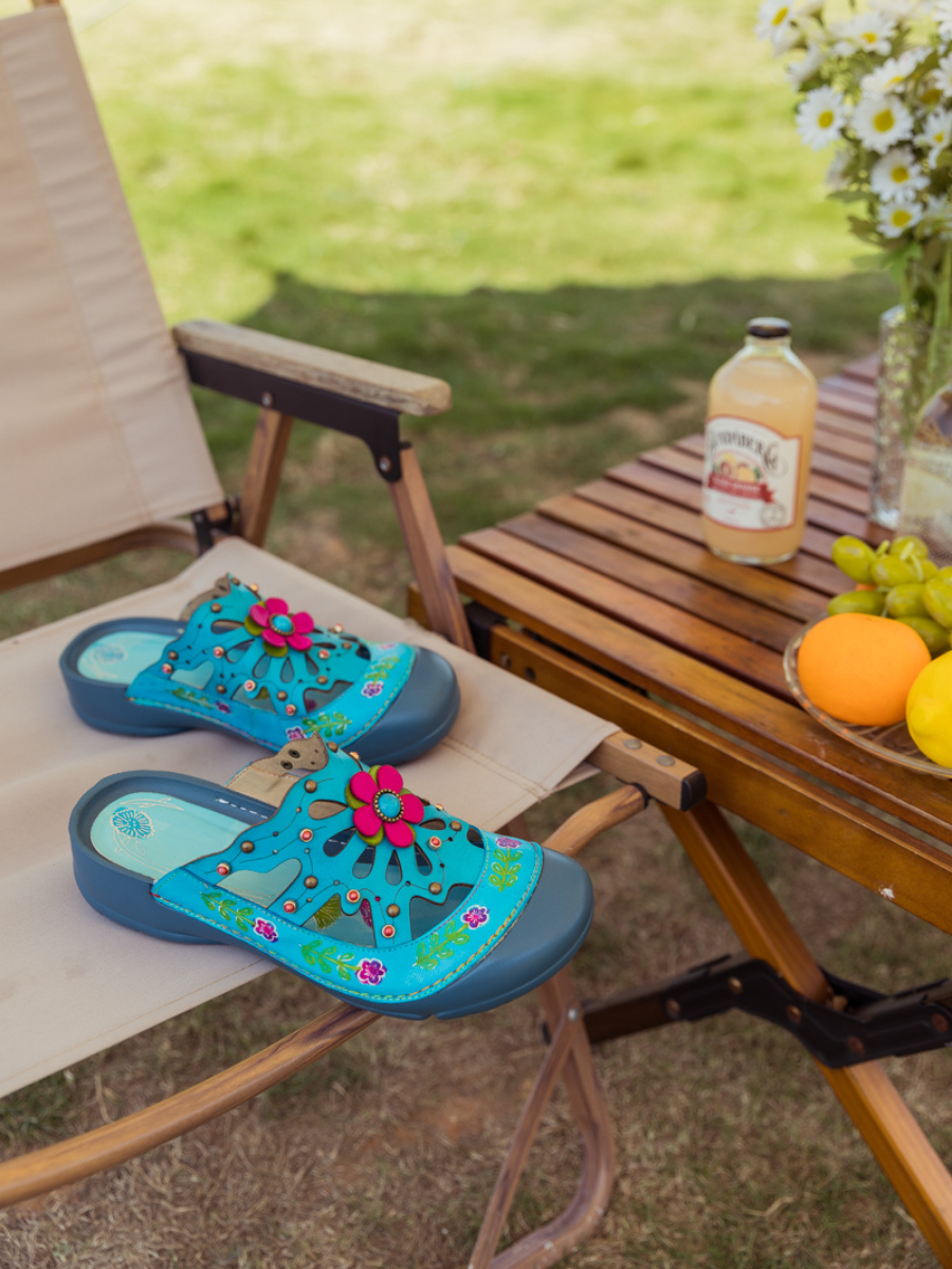 Put your fashionable foot forward in these floral sandals flaunting genuine leather and colorful appliqué for stylish sunny-day steps.