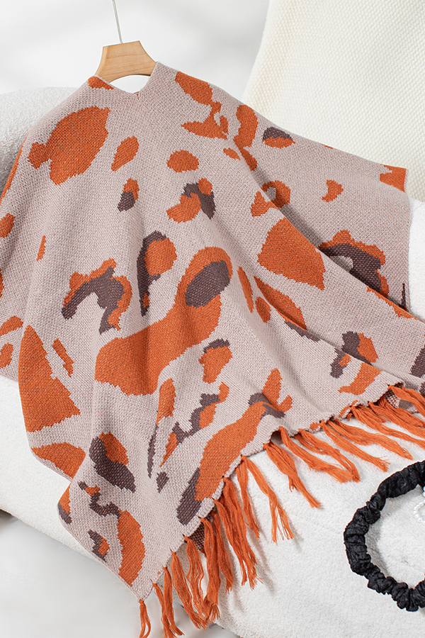 Fashionable Leopard Print Contrast Tassel Hem Loose Knitted Shawl