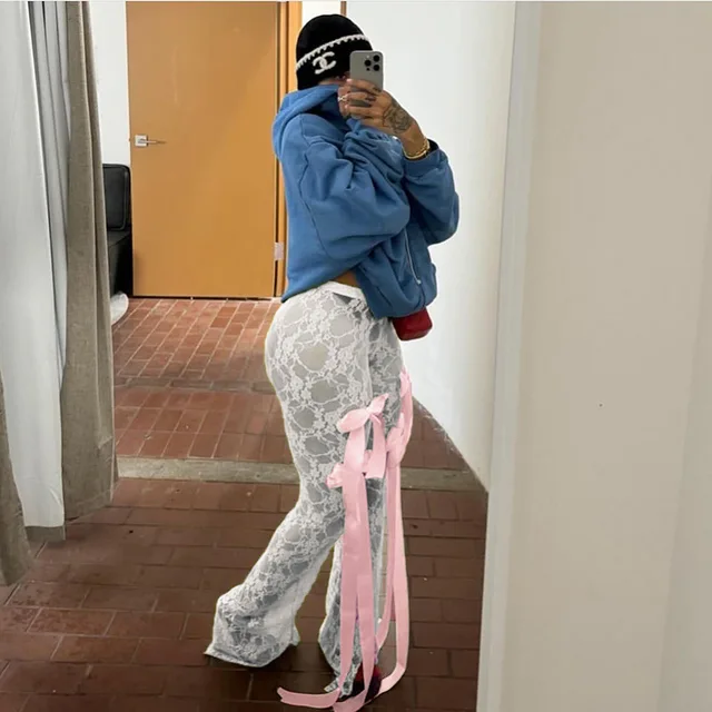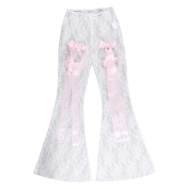 Ootddress Bow Splice Lace Pants Women Sheer Slim High Waist Bottoms Hot Girls 2025 Beach Party Sexy Club See Through Pant Ladies