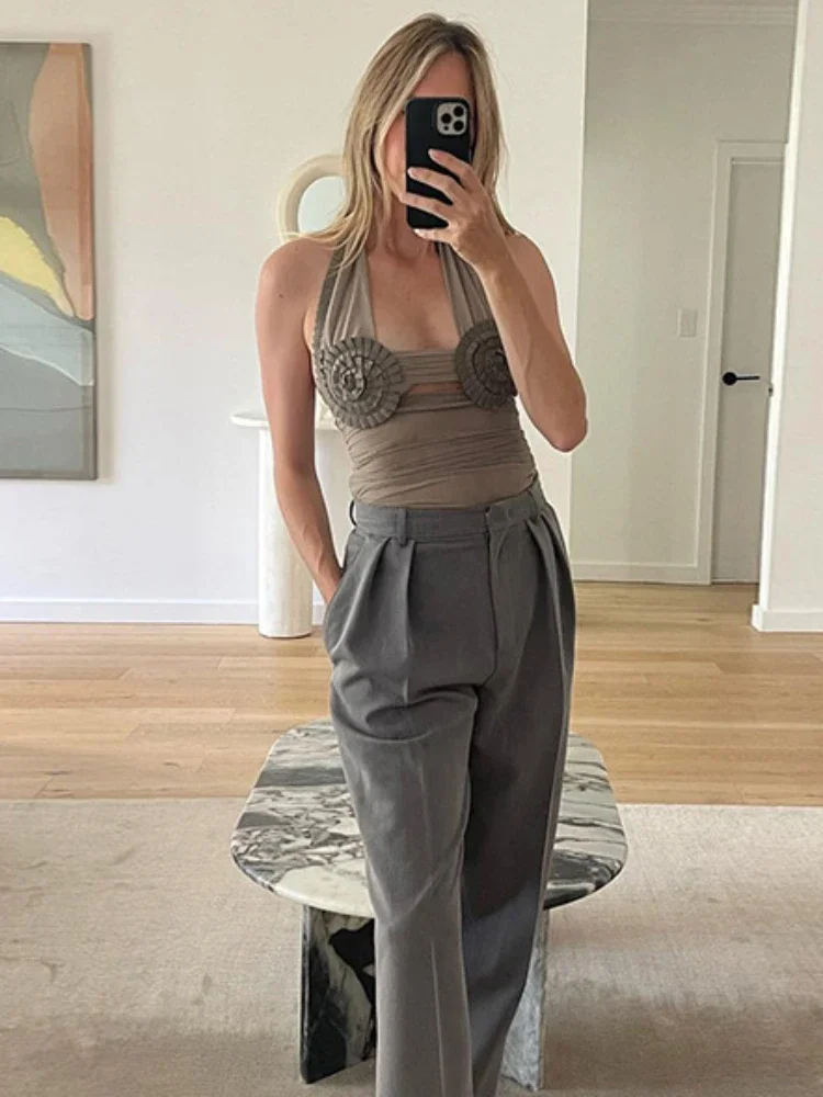 Folds Sunflower Tank Top Women Mesh Bodycon Sleeveless Slim Crop Tops Ladies Club Party Sexy Backless Bandage Vest Woman