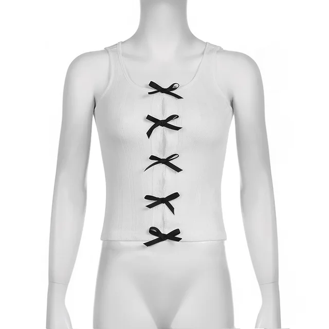 Lace Bow Splice Tank Top Women Sexy Hollow Out Slim Sleeveless Shirts Hot Girls Bodycon Fashion Crop Tops Woman Clothing