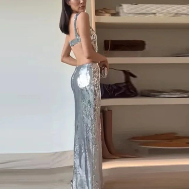 Temperament Sexy Backless Hollow Suspender Party Dress Fashionable Sequin High Waist Slim Formal Occasion Women’s Evening Dress