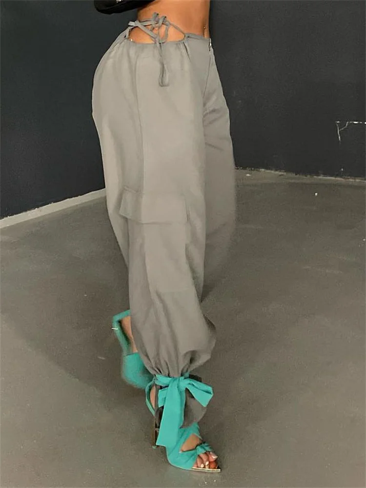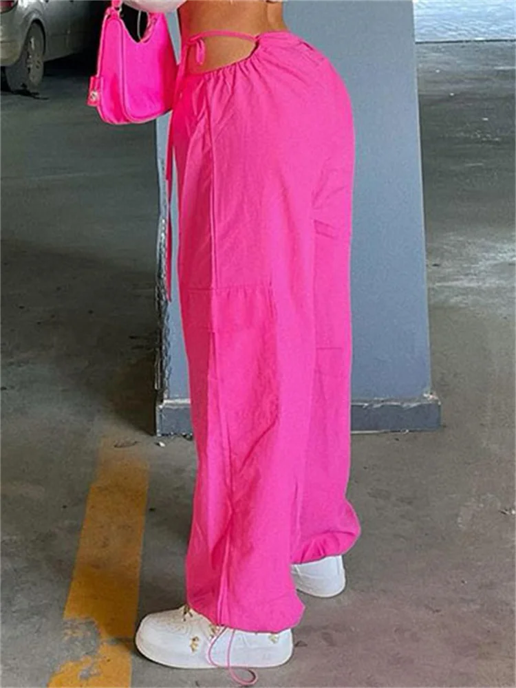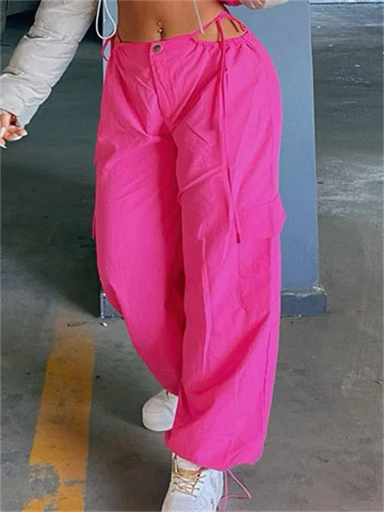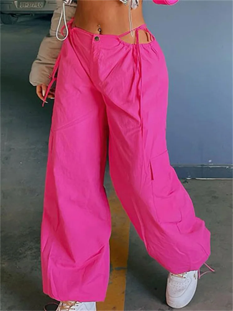 Pink Lace-Up Casual Cargo Pants For Women Wide Leg Baggy High Street Pocket Trousers Hollow Out Fashion Designer Trousers