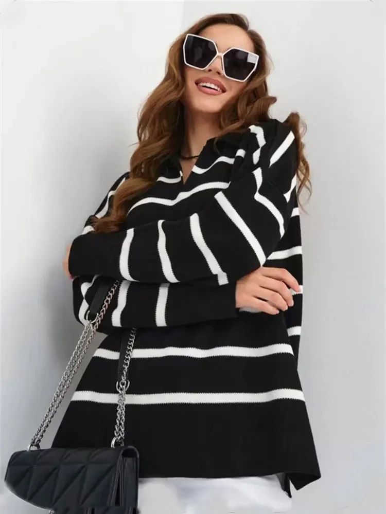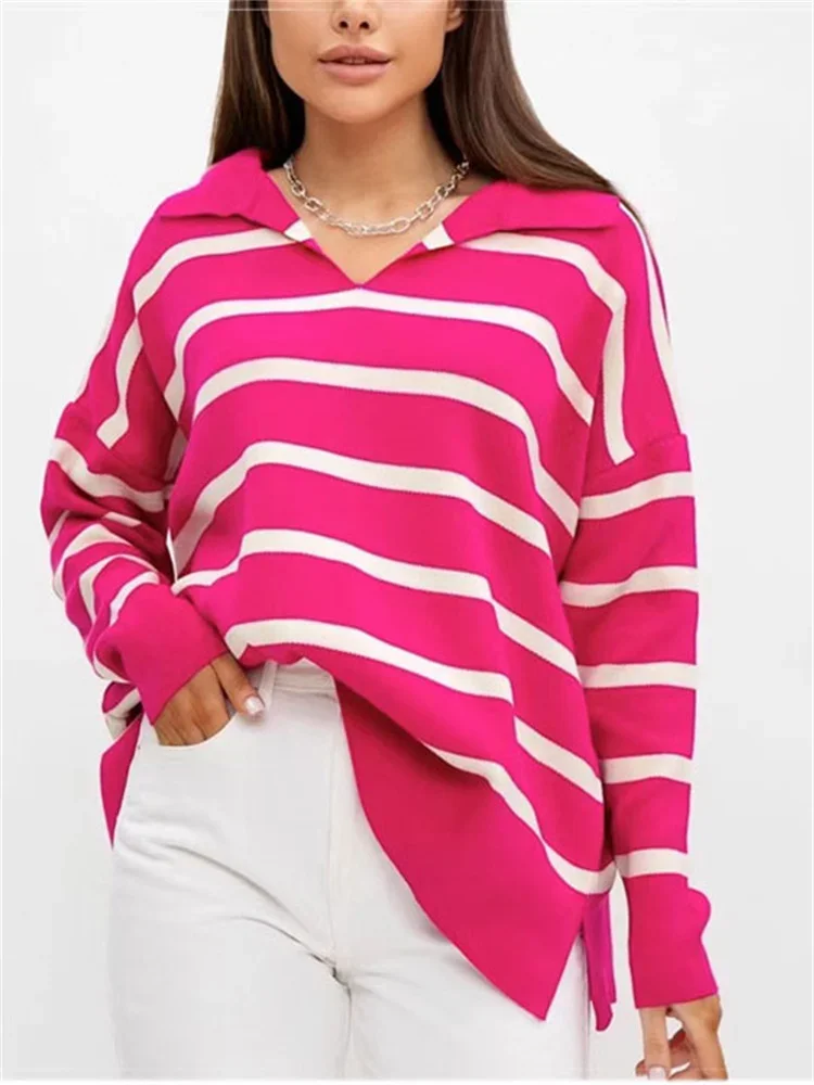 Ootddress V-Neck Knit Casual Pullover For Women Striped Slim Long Sleeve Contrast Loose Sweater High Street Knitwear Pullover TopOotddress V-Neck Knit Casual Pullover For Women Striped Slim Long Sleeve Contrast Loose Sweater High Street Knitwear Pullover Top