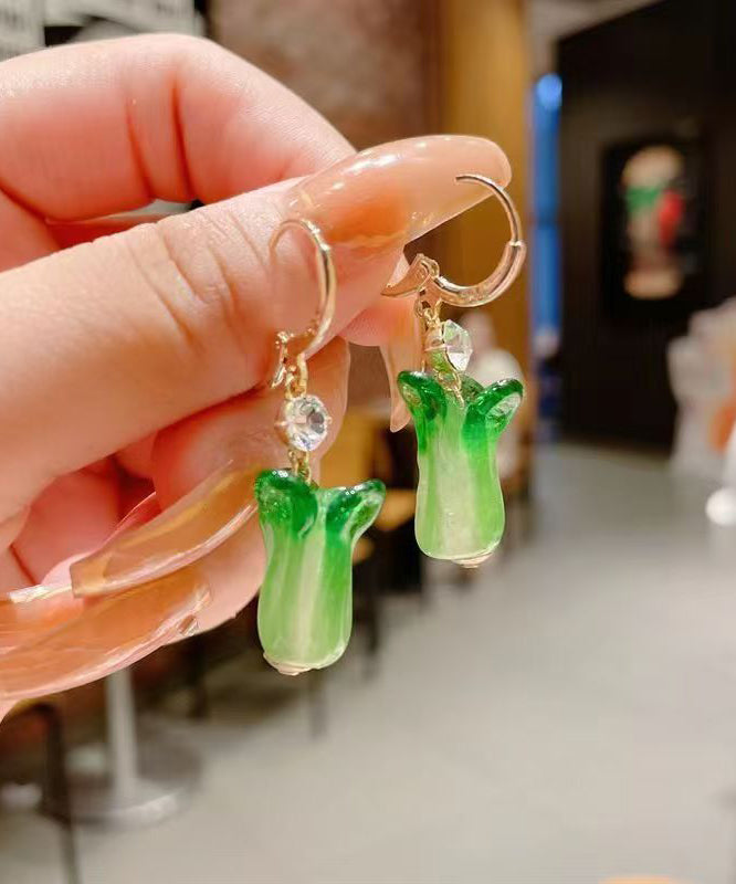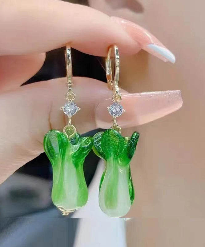 Unique Green Sterling Silver Overgild Colored Glaze Chinese Cabbage Drop Earrings