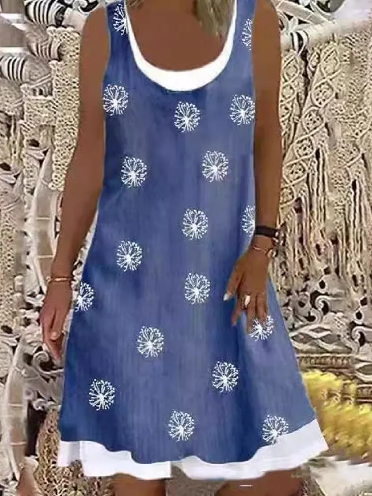 Women’s Print Dresses Summer O Neck Sleeveless Fake Two Piece Loose Casual Dress Female Holiday All-match Vestidos Hot Style New