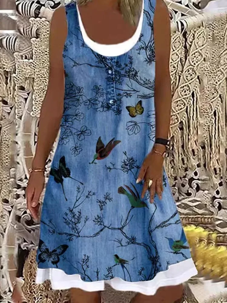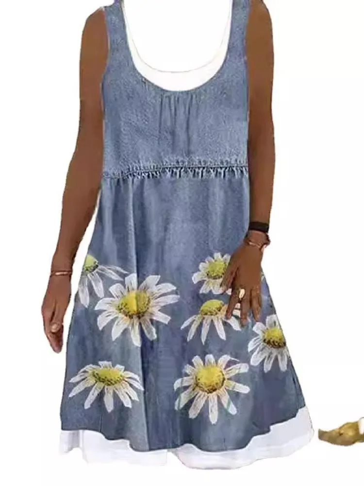Women's Print Dresses Summer O Neck Sleeveless Fake Two Piece Loose Casual Dress Female Holiday All-match Vestidos Hot Style New