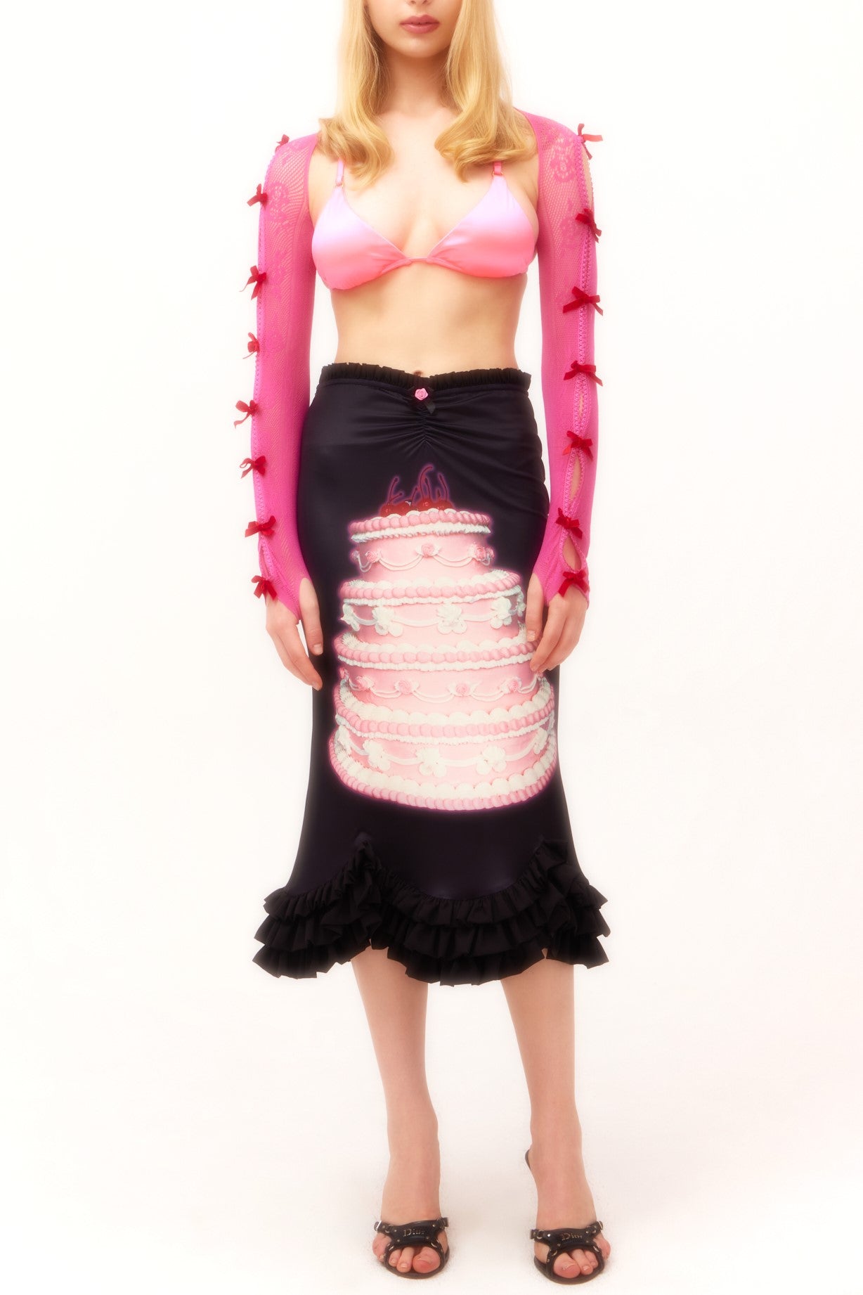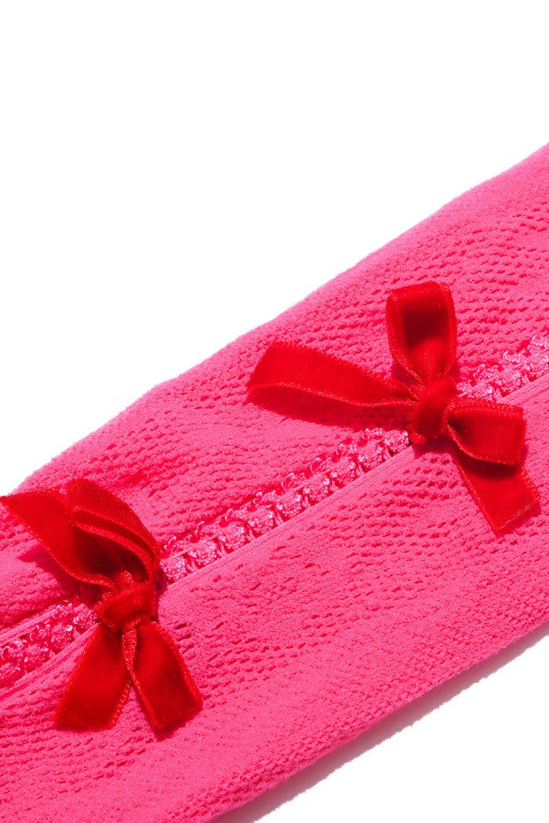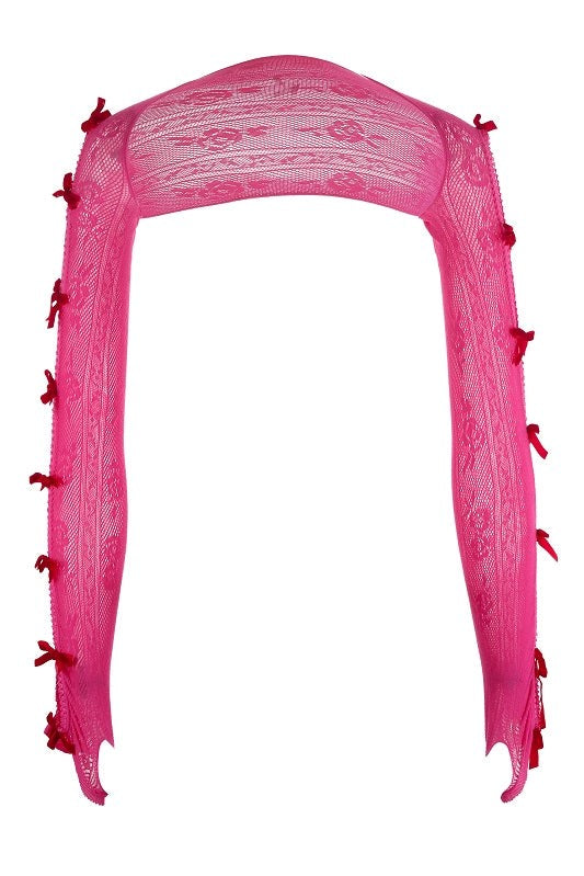 "Add a touch of elegance and quirkiness to any outfit with Yara Red Velvet Bow Rose Pink Lace Oversleeves. The perfect accessory for those who want to stand out from the crowd. (Note: may cause compliments overload!)